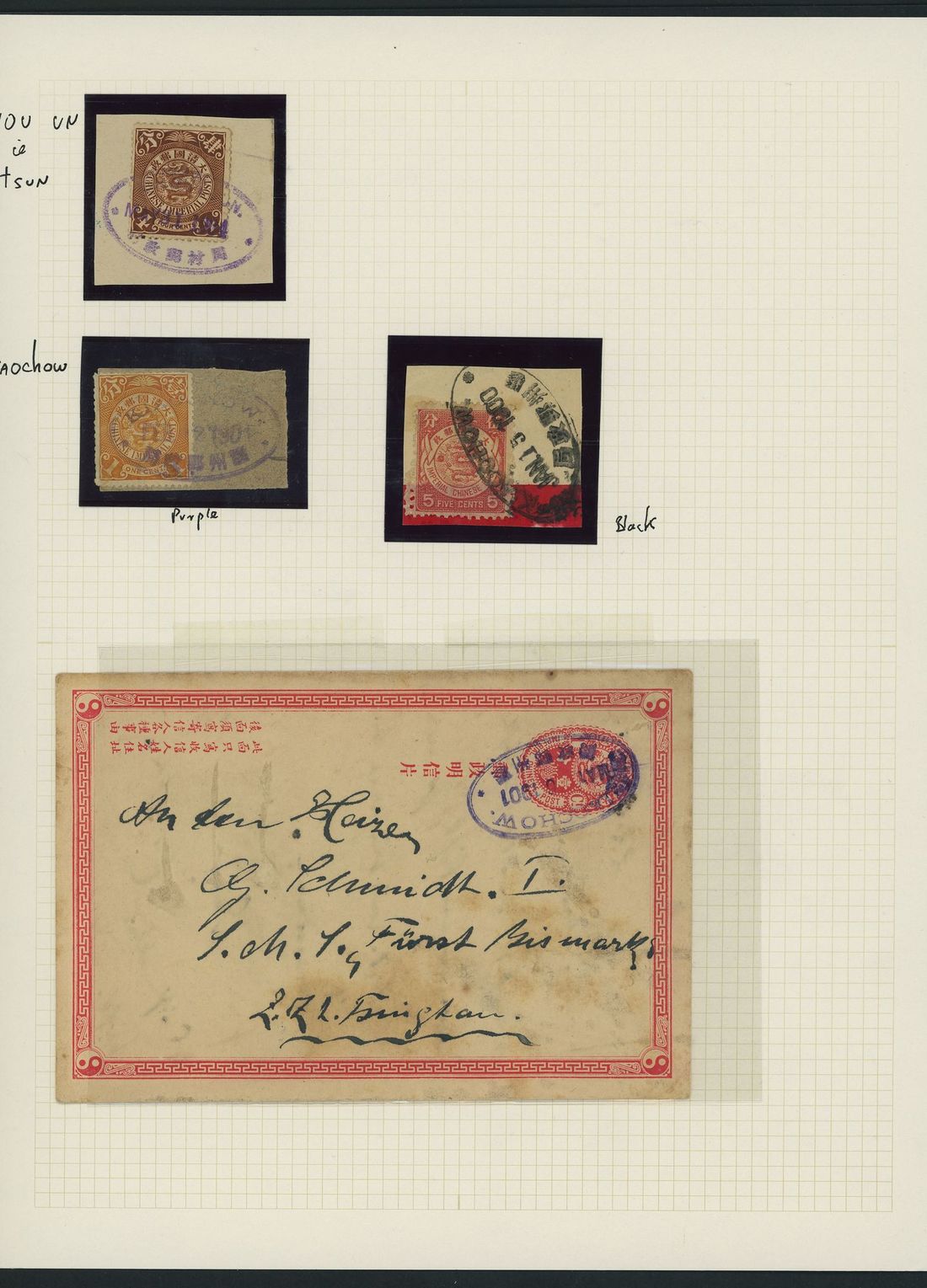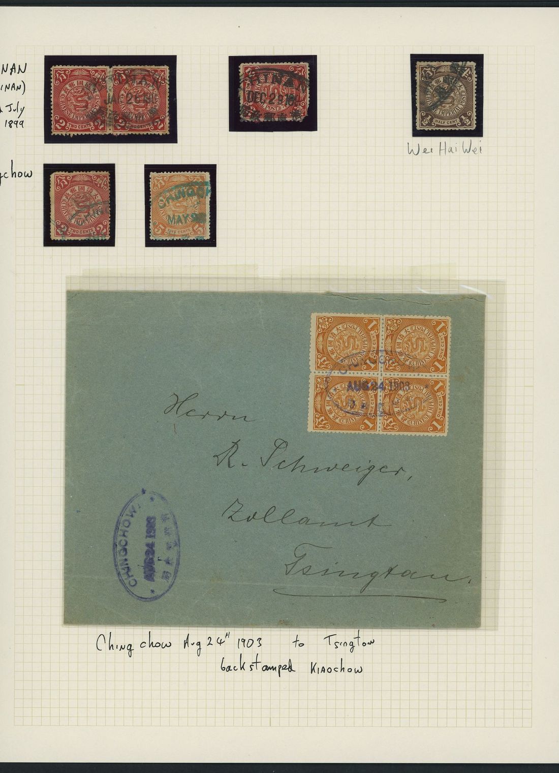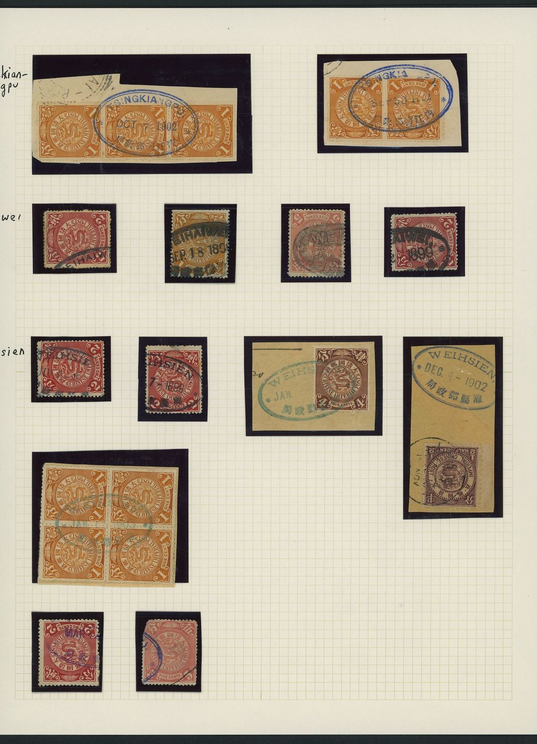 A collection on leaves which includes Kiaochow in purple on red band covers (3), two with stop after "W", Chingchow in purple, Peking with serif (2) and sans serif (2, different sizes) lettering; also a further selection on stamps or pieces. A good selection