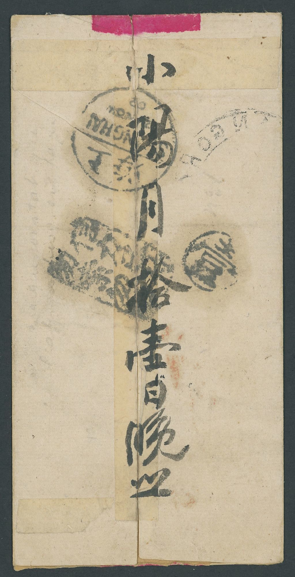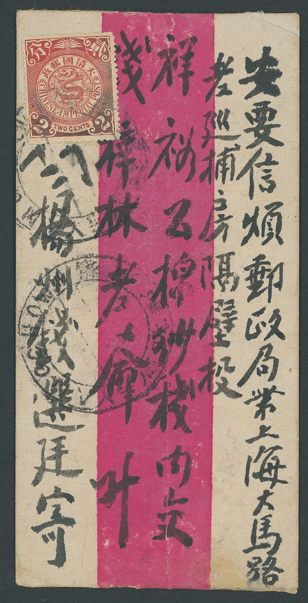 Yangchow: 1902 red band envelope to Shanghai bearing C.I.P. 2c. tied by a good strike of the non-standard Yangchow Dollar dater with a second strike alongside, the reverse bearing a good strike of the "already paid" handstamp and Shanghai bilingual c.d.s. (2.11); there are a couple of minor age marks. A very good cover for this scarce postmark. Photo