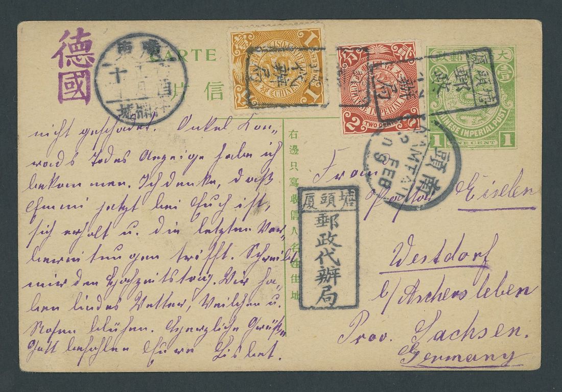 Tongtowha: 1909 (26.1) C.I.P. 1c. stationery card to Germany, uprated with C.I.P. 1c. and 2c. tied by superb strikes of Tongtowha Postal Agency rectangle with Kanlanhu (31.1) and Namtau locally produced bilingual c.d.s. (2.2), the reverse with Victoria Hong Kong (2.2) c.d.s. A superb and desirable cover. Photo