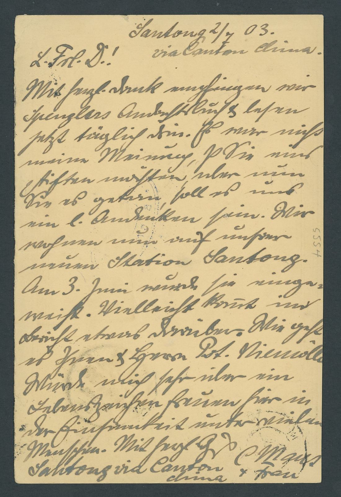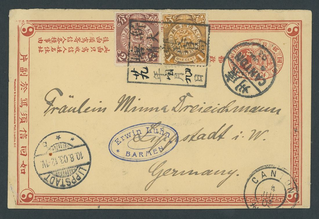 Suntong: 1903 (2 July) China second issue stationery card to Germany, uprated with C.I.P. 1c. and 2c. tied by a superb strike of the wooden carved district dater with year, month, date insertion, Canton bilingual c.d.s. (4.7), French P.O. Canton c.d.s. and Lippstadt arrival (10.8). A stunning and important card. Ex Paul Chang. Photo