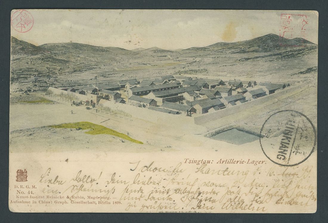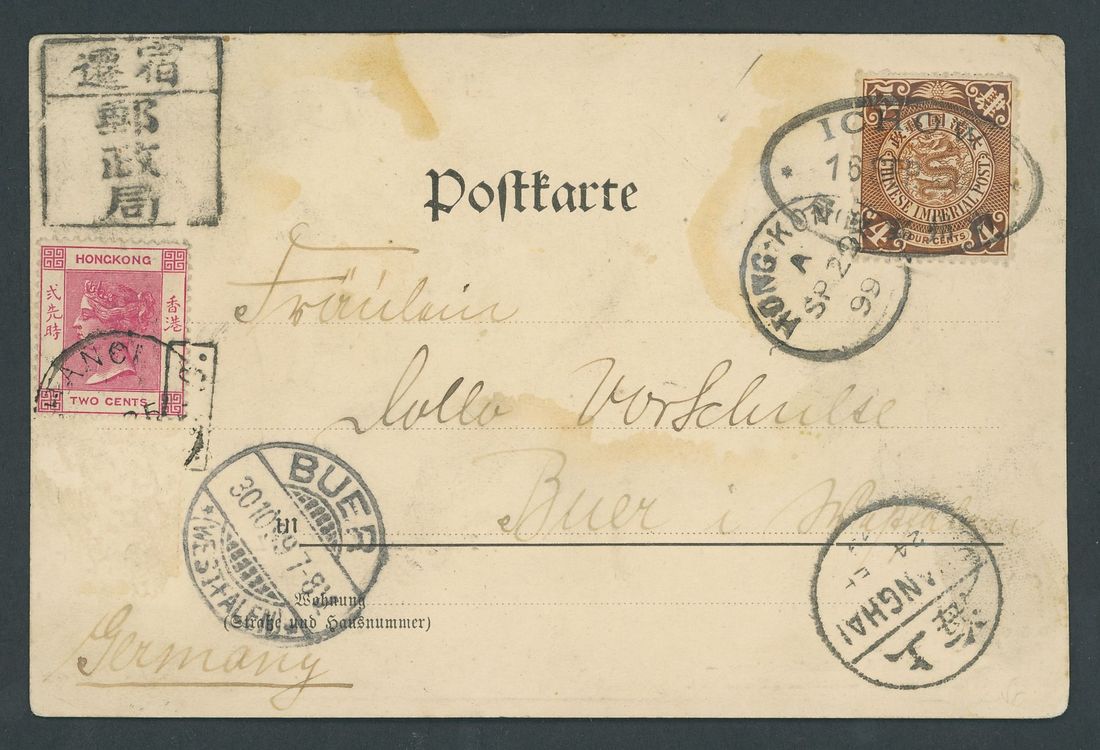 Sutsien: 1899 (16 Sept.) picture post card to Germany bearing C.I.P. 4c. tied by Ichow type I bilingual oval datestamp and showing a fine strike of Sutsien rectangle in left corner, with Hong Kong 2c. carmine (the second stamp missing) cancelled by part Shanghai c.d.s. and Chinkiang "I.P.O." tieprint, with Shanghai bilingual c.d.s. (24.9), Hong Kong (29.9) and Buer arrival (30.10) c.d.s., the picture side with Chinkiang bilingual c.d.s. (22.9); slight buckling. A very early date for the Ichow dated oval. Photo