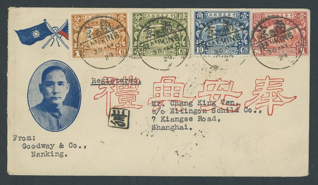 1929 State Burial of Sun Yat Sen 1c. to $1 set of four tied on first day cover by Nanking Chinese/English c.d.s., sent registered to Shanghai. Photo