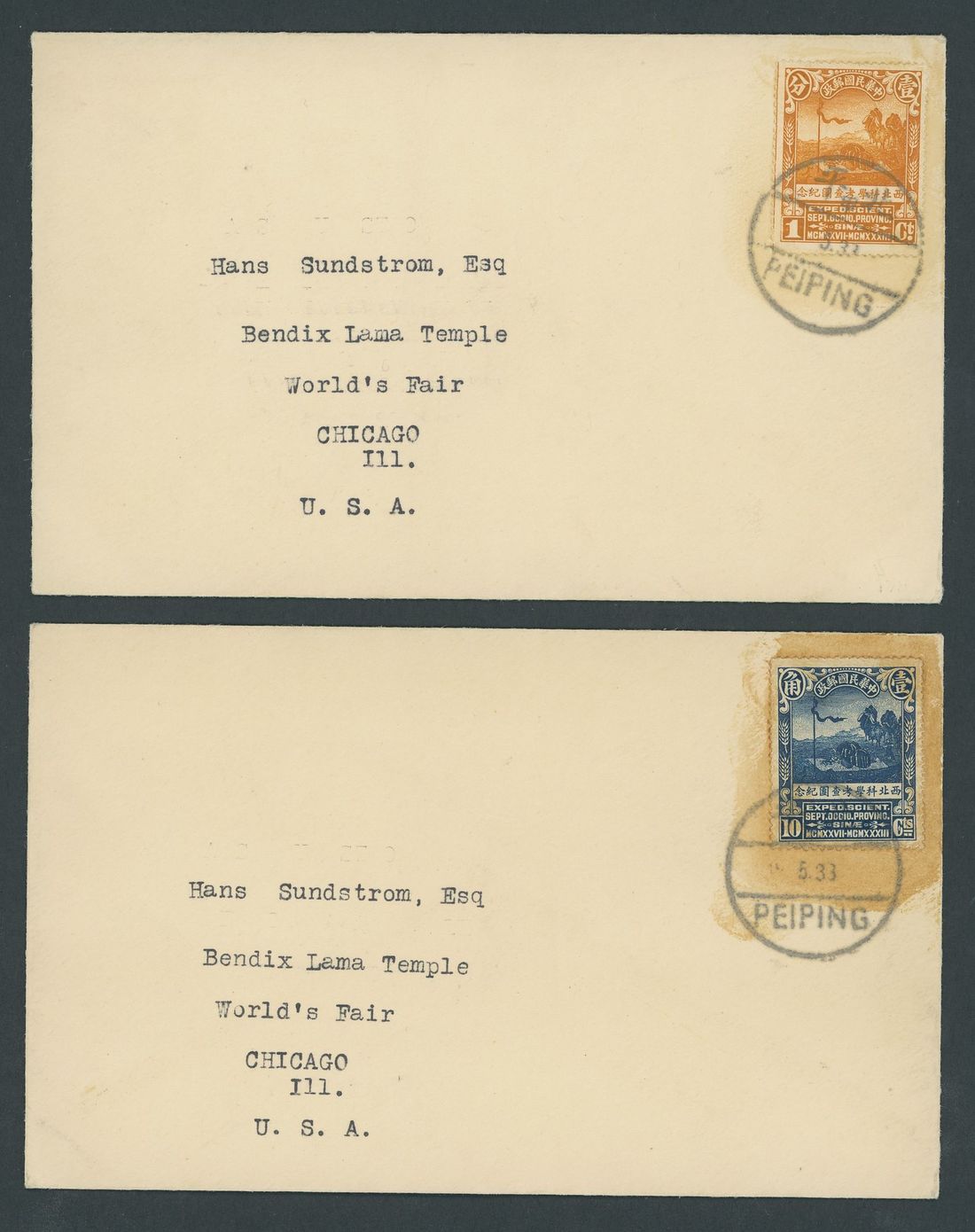 1932 North-West Scientific Expedition 1c. to 10c. set of four, each affixed to a philatelic envelope by Peiping Chinese/English c.d.s.; each is signed on the reverse by Sven Hedin and with a photocard of Sven Hedin