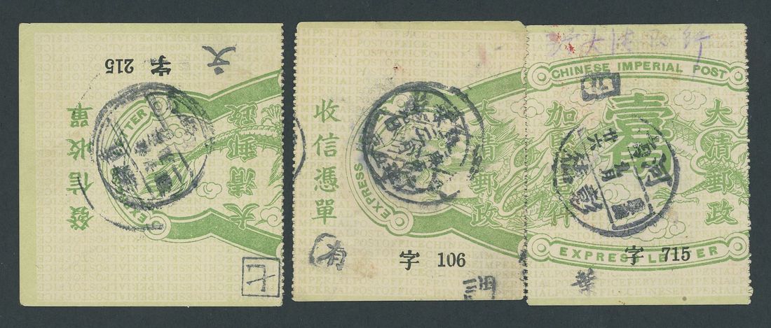Fourth Issue: the final three sections cancelled by lunar c.d.s., numbered "106", "715" and "215" respectively. Photo
