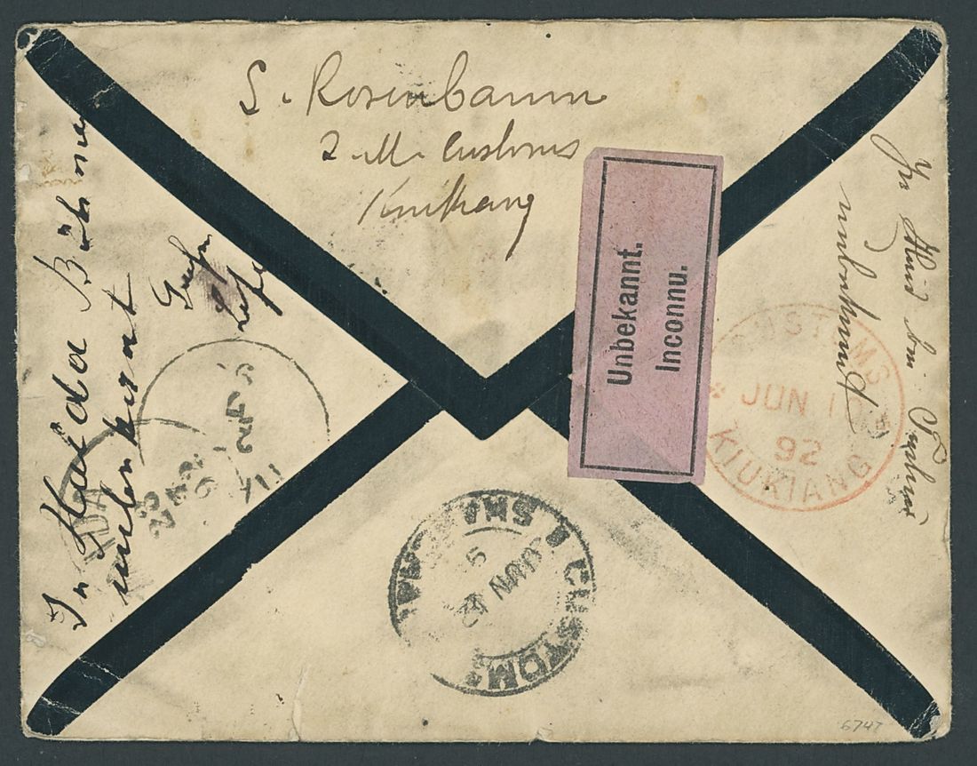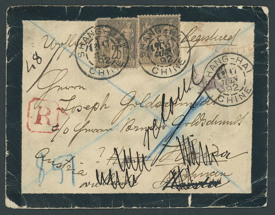 1892 (10 June) mourning envelope registered to Austria bearing a light strike of "