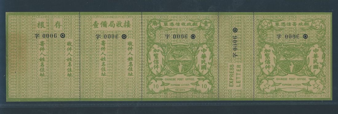 1913 with black numbers: 10c. strip of five numbered "0006"; fine. Chan E8; S.G. E266. Photo