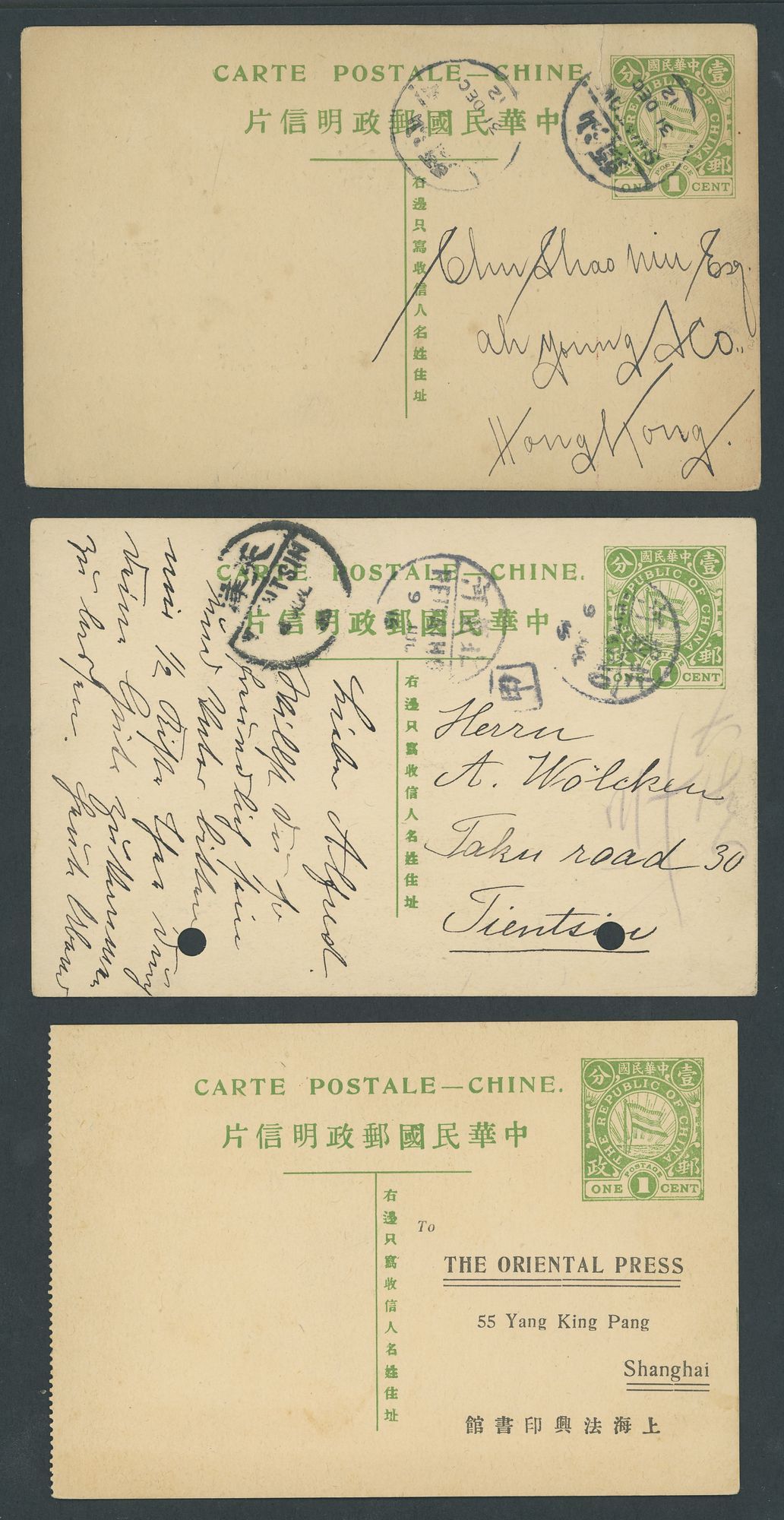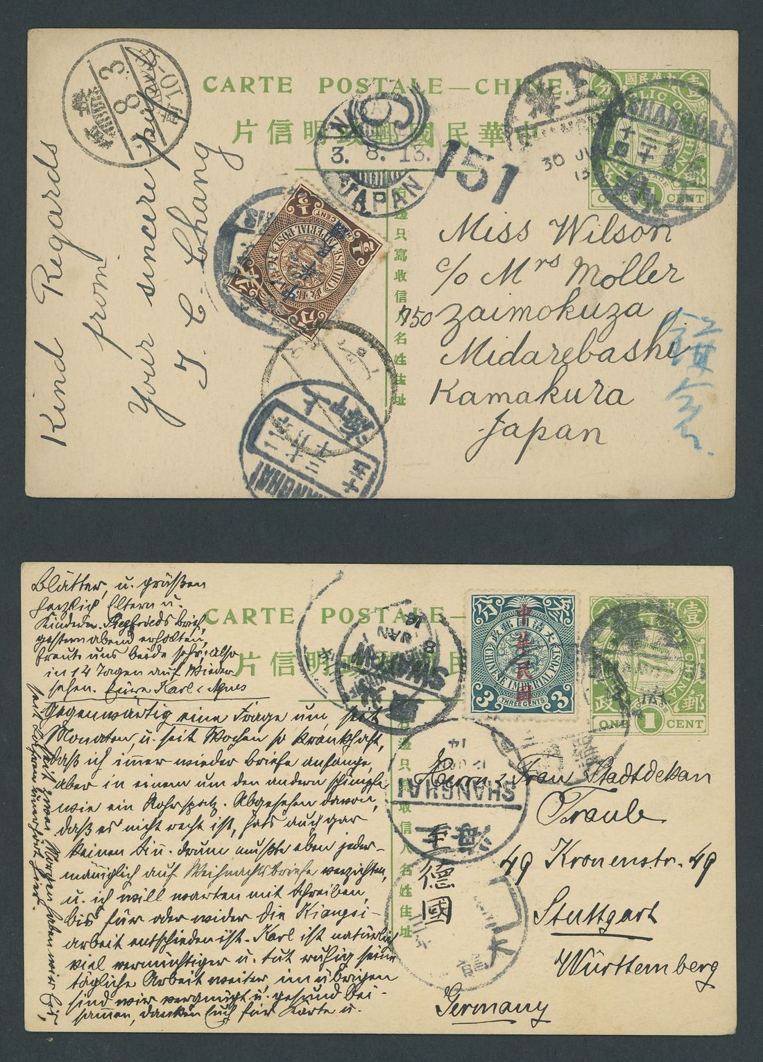 1912 National Flag: A group of 1c. green cards with "T" connected unused and used (2) to Japan and Germany and "T" not connected used (2, faults). (5 cards)