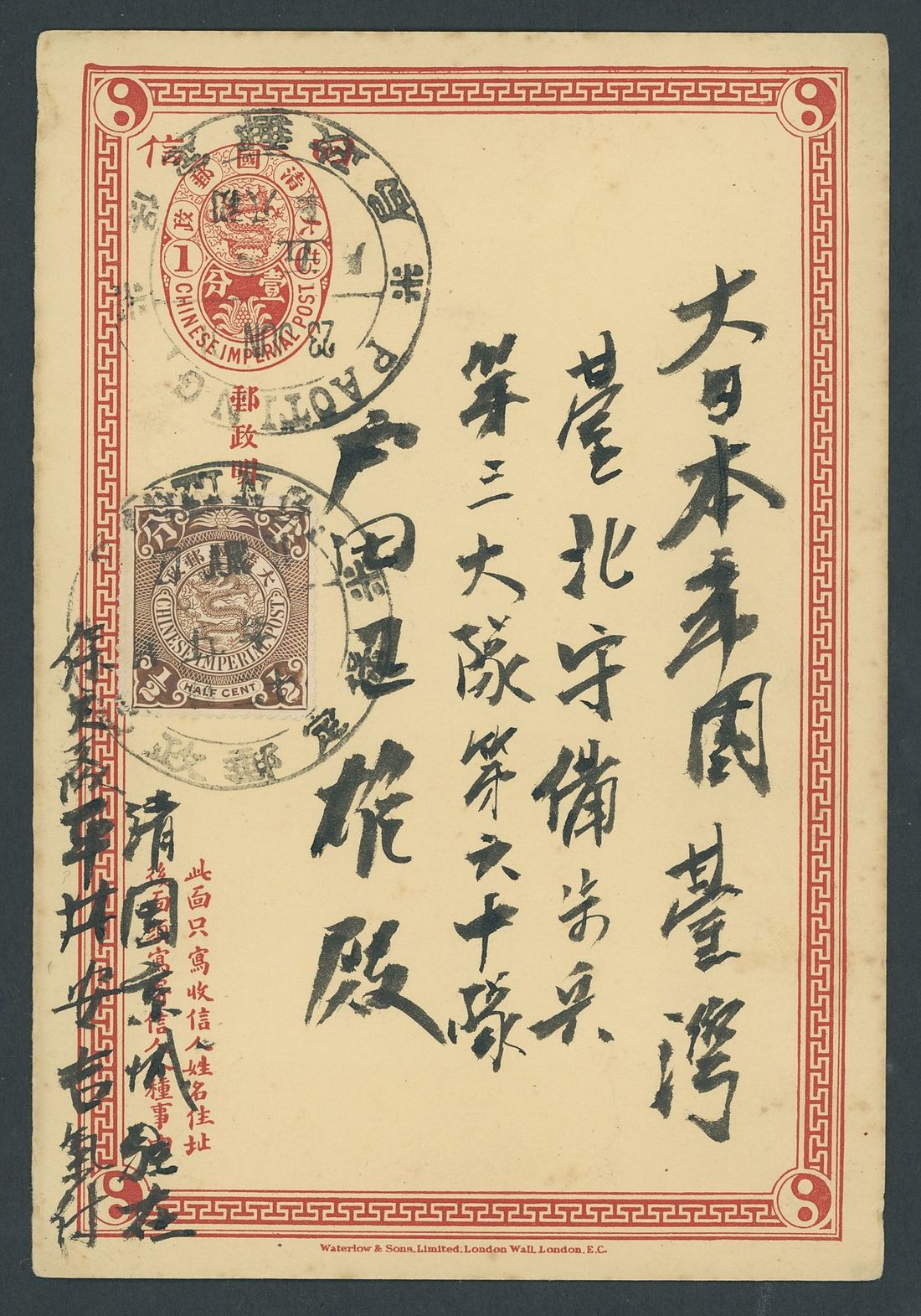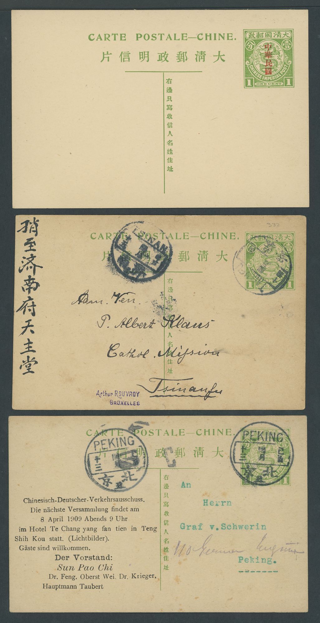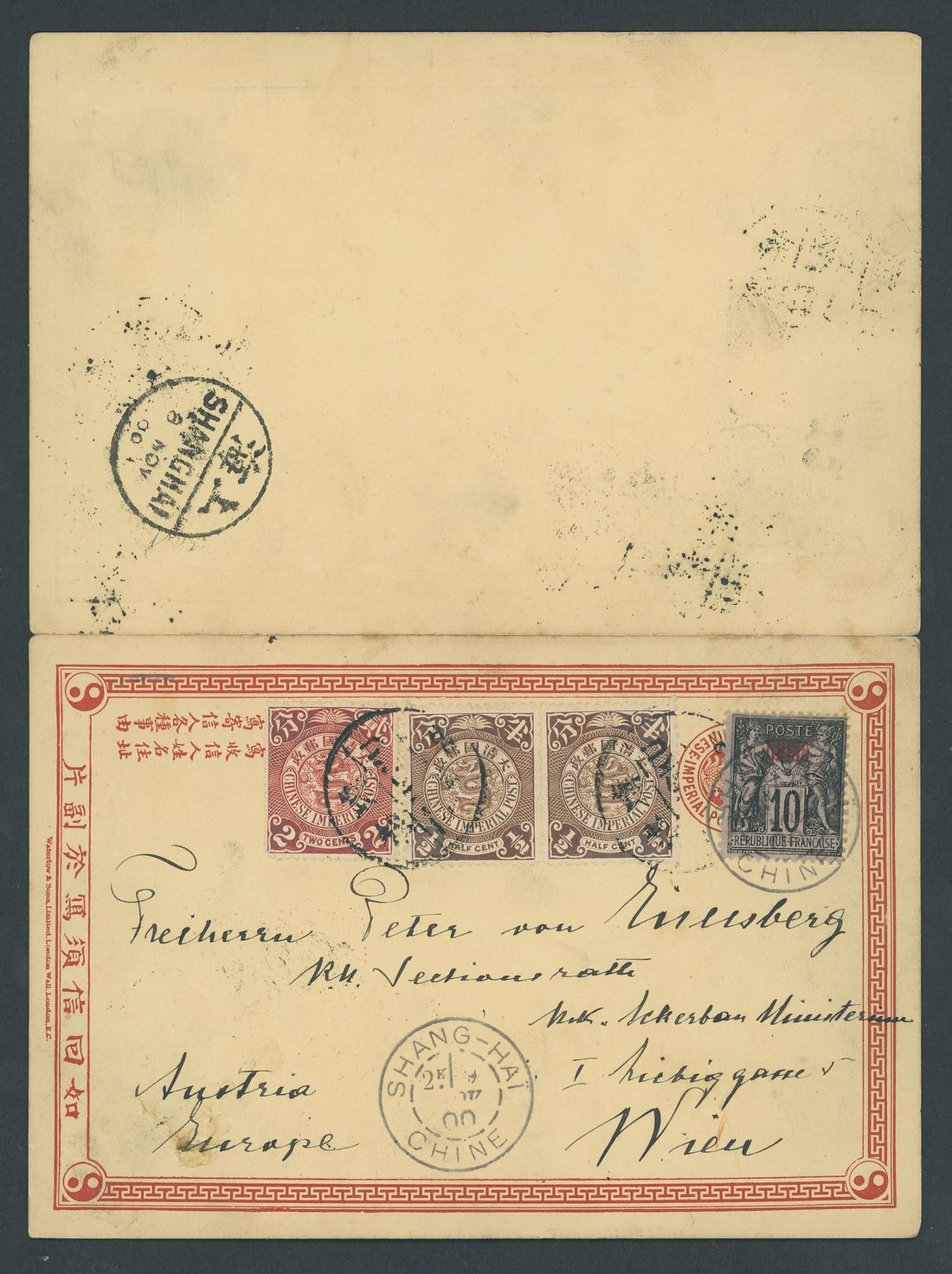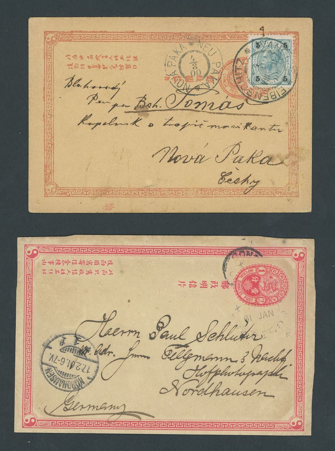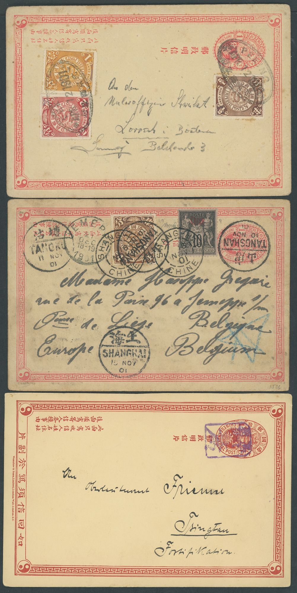 A small group which includes first issue 1c. to Germany (adhesive missing) cancelled by part Customs c.d.s., to Belgium uprated 4c. cancelled by Tangshan bilingual c.d.s. with France "Chine" 10c. and with Tangku bilingual c.d.s. transit; second issue 1c. with C.I.P. ½c. cancelled by Paoting Dollar dater, uprated C.I.P. ½c. (2) and 2c. cancelled by Tangku bilingual c.d.s. with France "Chine" 10c., small Post Office tombstone in violet, uprated C.I.P. ½c., 1c. and 2c. cancelled by Peking oval dater plus some others (10 cards)