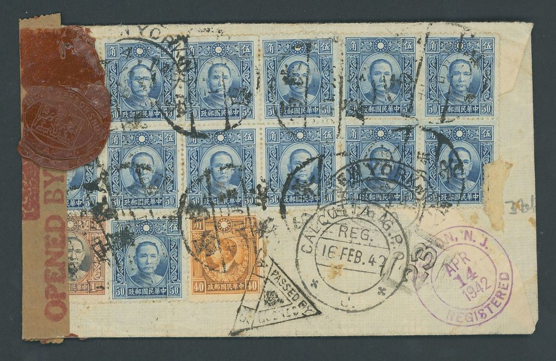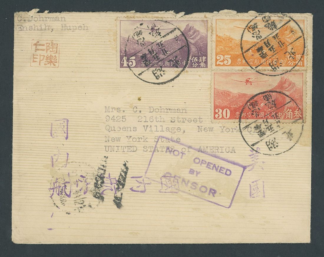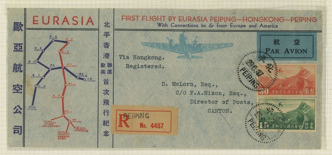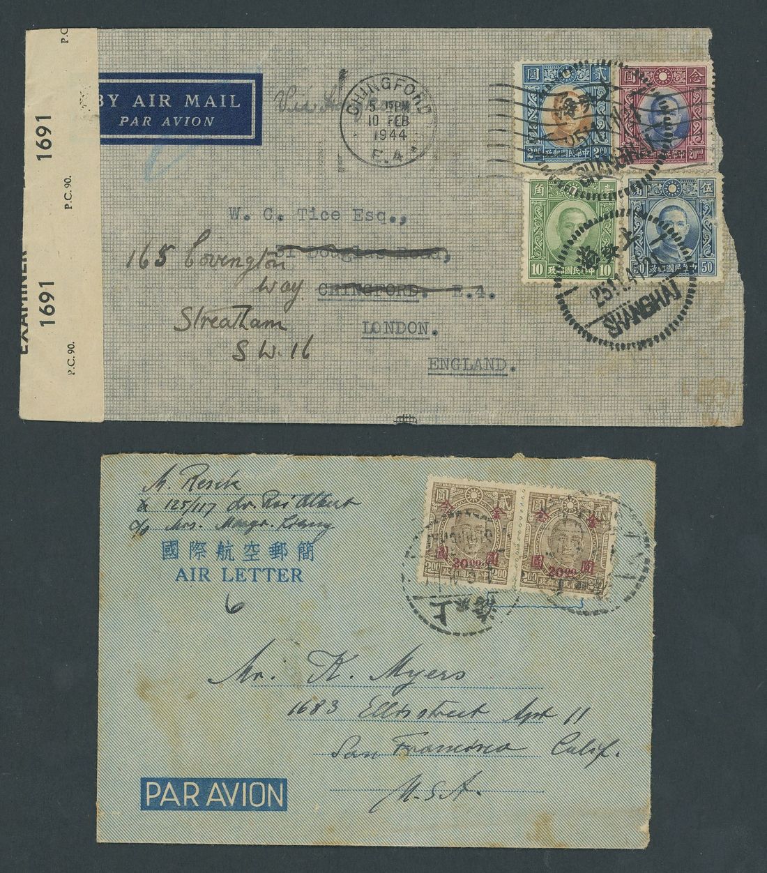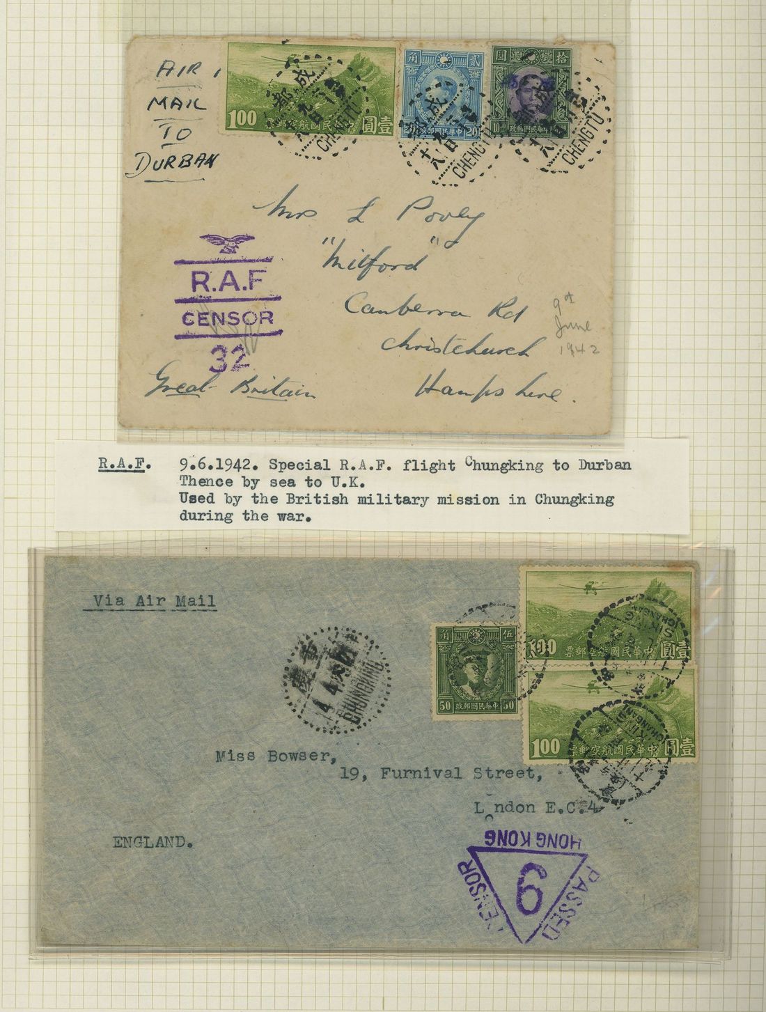 1917-42 a selection of covers on pages some first and other flights including Tientsin to Peking, Nanking to Peking, Chungking - Hami - Tihwa, Canton to Shanghai, Chungking to Chendu, Peiping to Hong Kong, Manchukuo, Clipper and other international flights with different airlines and routes, 1942 R.A.F. flights Chungking to Durban (2). (17 covers)