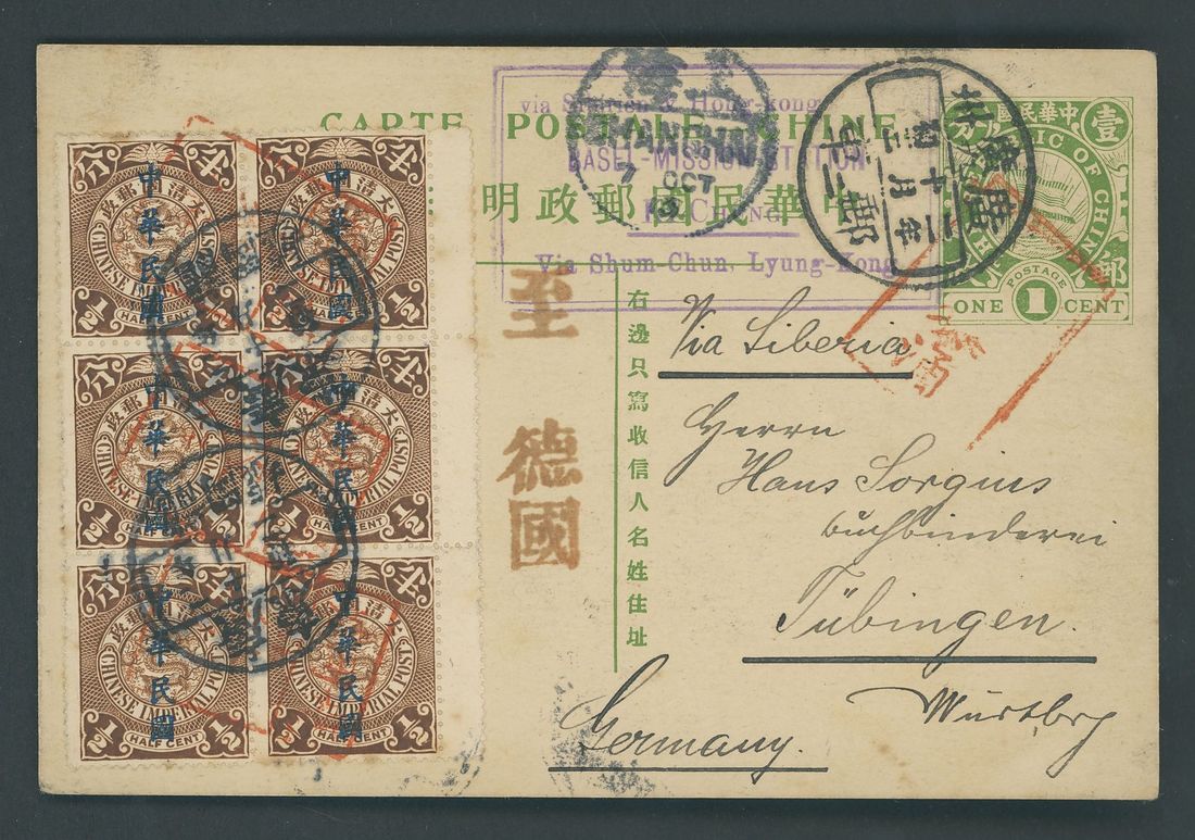 Kwaichung: 1914 (3 Oct.) 1c. Flag stationery card to Germany "Via Siberia", uprated with Waterlow Republic overprint ½c. block of six cancelled by rectangular letter box of Kwaichung in red and Lungkonghu, Kwangtung Chinese c.d.s. with Canton-Kowloon Second Section c.d.s., Shanghai bilingual (7.10) alongside; with boxed sender's handstamp in purple "via Shanghai & Hong Kong, Basel Mission Station, Ki Chung, via Shum-Chun, Lyung-Kong". A stunning card. Photo