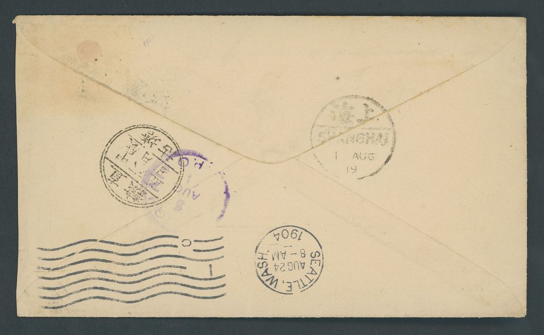 Shanhaikwan to Peking Travelling Post Office: 1904 (July) envelope to New York bearing C.I.P. 10c. green tied by a fair strike of the rectangular Shanhaikwan to Peking section 1 cancellation, the reverse bearing lunar c.d.s., Shanghai bilingual and Shanghai I.J.P.O. (3.8) c.d.s. plus Seattle machine postmark (24.8); Mount Vernon arrival (29.8) on the address side; a few light age marks. Photo