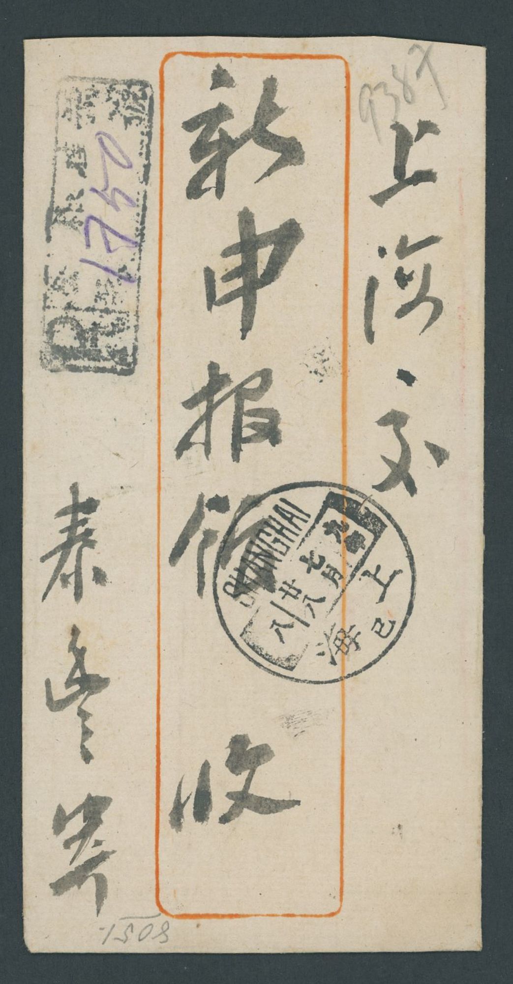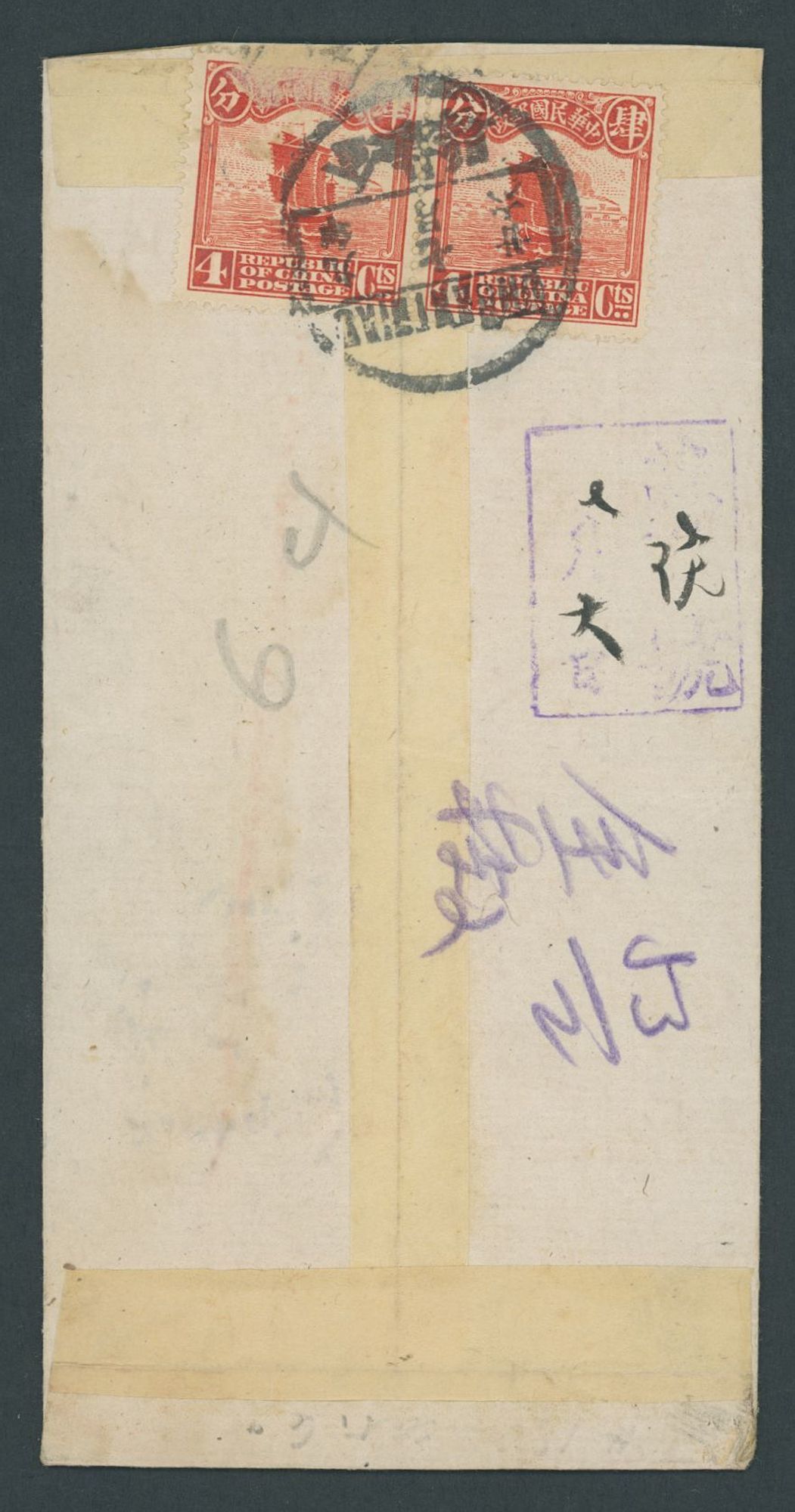 Chuanchiao: 1921 (26 July) envelope registered to Shanghai bearing, on the reverse, first Peking Junk 4c. (2) tied by Chuanchiao, Anhwei English/Chinese c.d.s. with a fair strike of boxed handstamp in purple with manuscript insertion alongside, the address side with the boxed registered handstamp numbered "1750" and a superb strike of the Shanghai English/Chinese arrival c.d.s. Very scarce. Photo