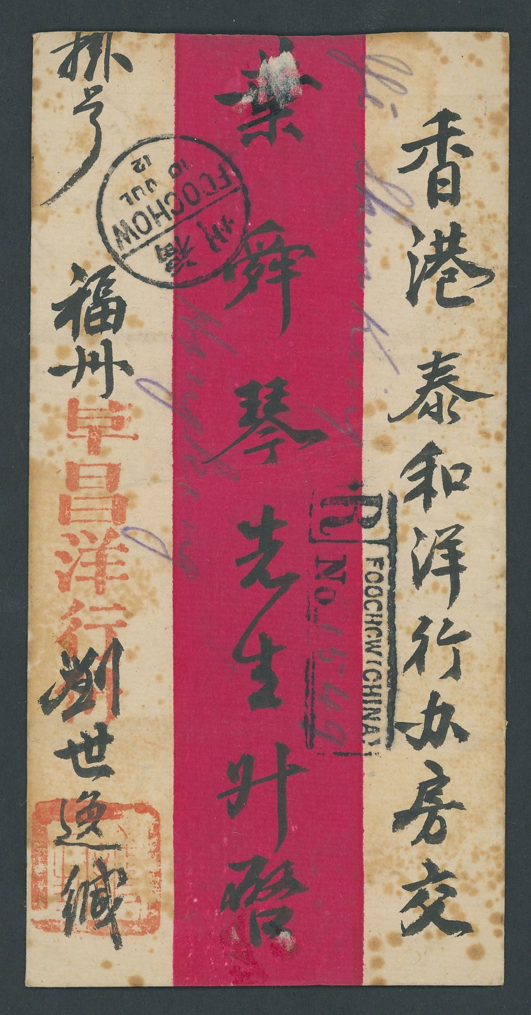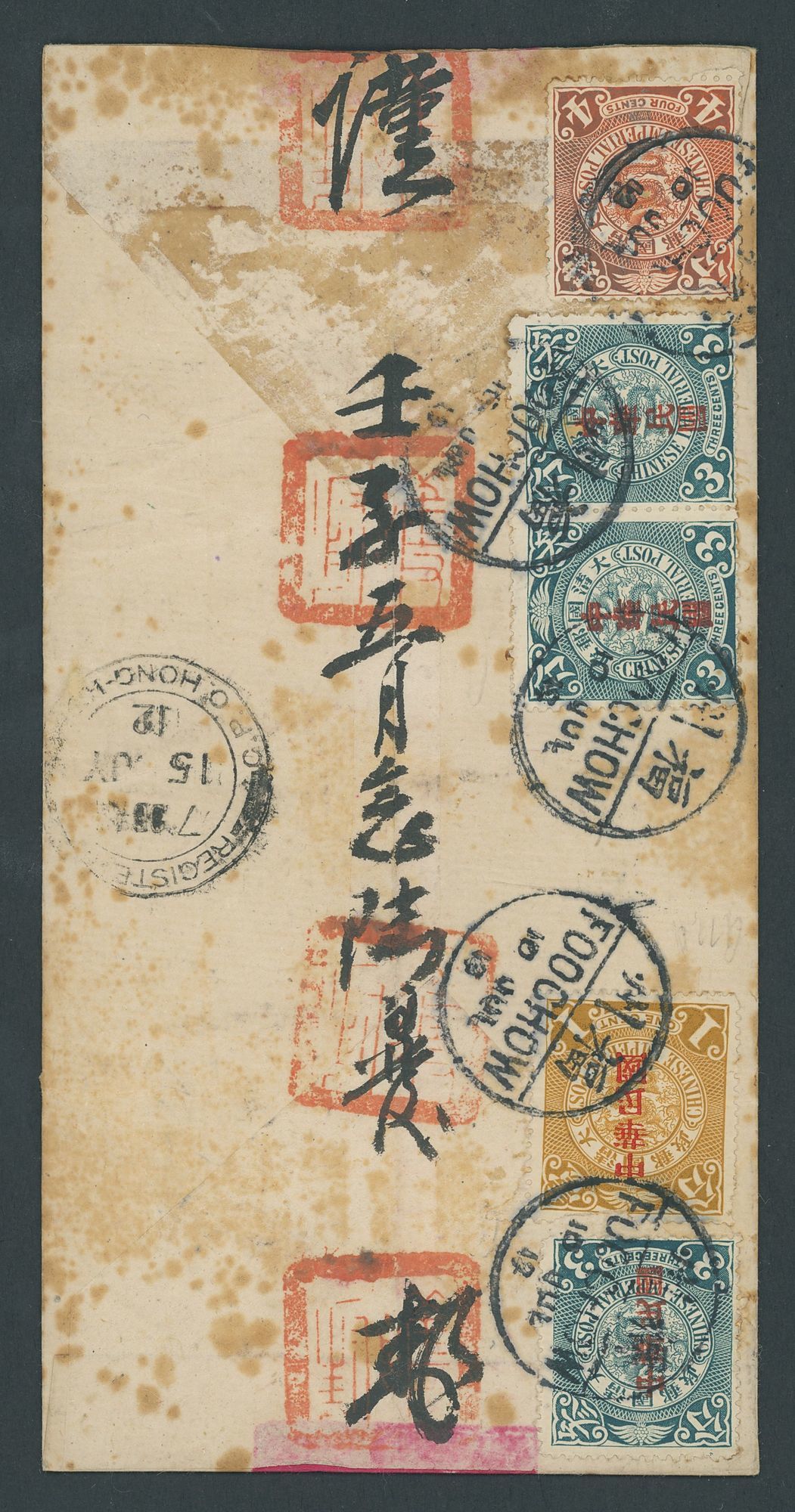 Foochow: 1912 (10 July) red band envelope registered to Hong Kong bearing, on the reverse, C.I.P. 4c. with Republic overprint 1c. and 3c. (3) tied by Foochow bilingual c.d.s. with Registered Hong Kong arrival (15.7) alongside, the address side with fine strike of the boxed registration handstamp and another bilingual c.d.s.; some tone spotting. Sent from Chuchen. Photo