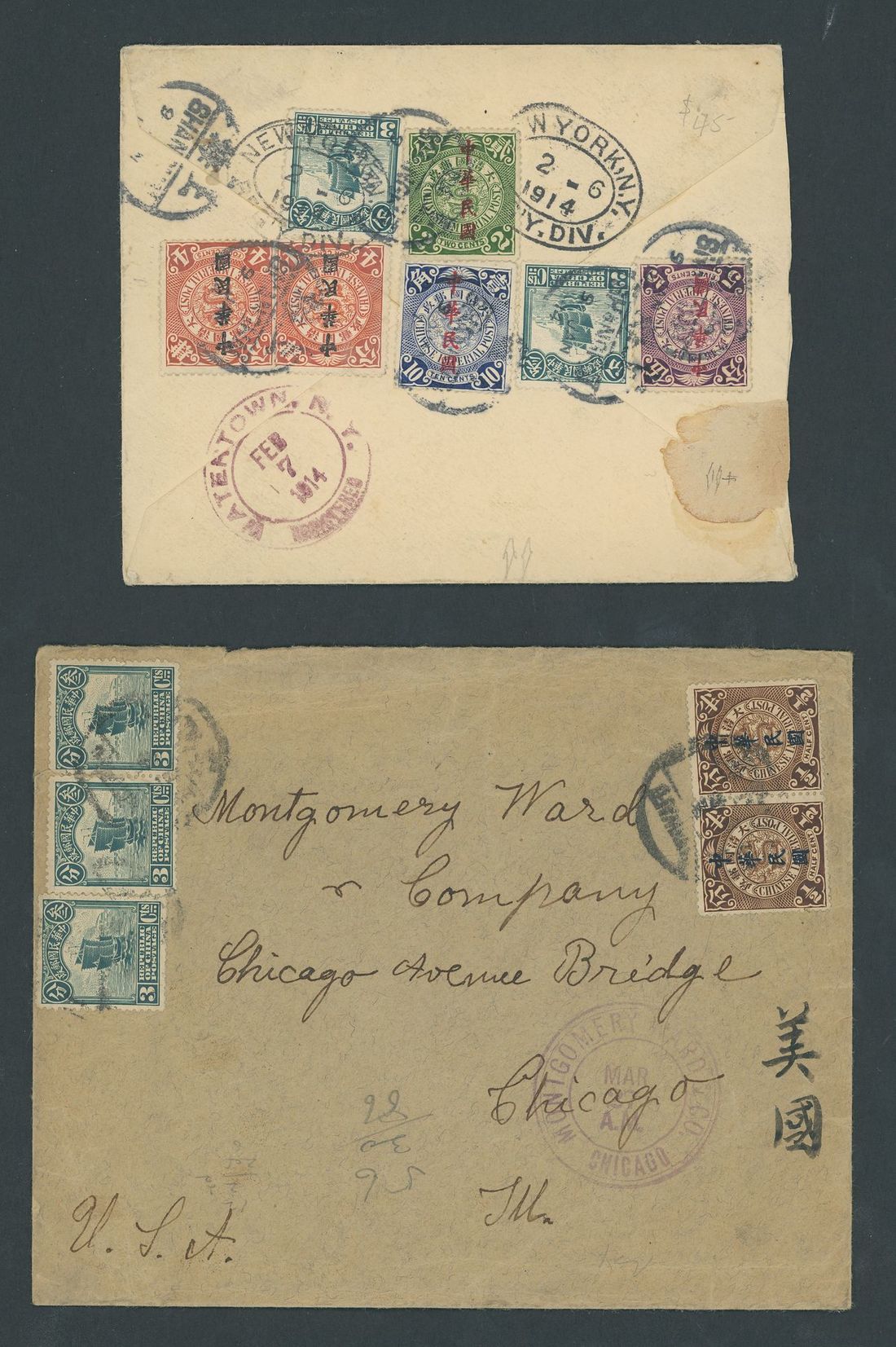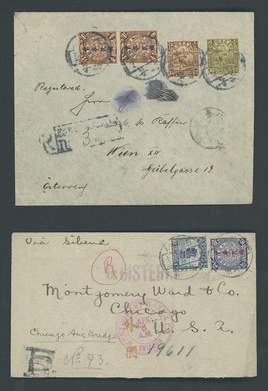 A group of mixed issue covers with 1912 Republic overprint with Junk issues including 1914 envelope registered to U.S.A. "Via Trans Siberian R.R" with 27c. franking and bearing a good strike of Kiuntang boxed registered handstamp; envelope from Soochow to U.S.A. bearing, on the reverse, 28c. franking; envelope registered to U.S.A. "Via Siberia" bearing 20c. franking; 1915 envelope registered to Vienna bearing 32c. franking cancelled by Fangtse c.d.s. and with faint boxed registered handstamp, envelope to Chicago bearing, on the reverse, 10c. franking tied by Ningpo c.d.s., envelope to Chicago bearing 10c. franking. Good covers. (6 covers)