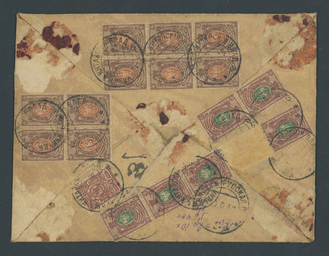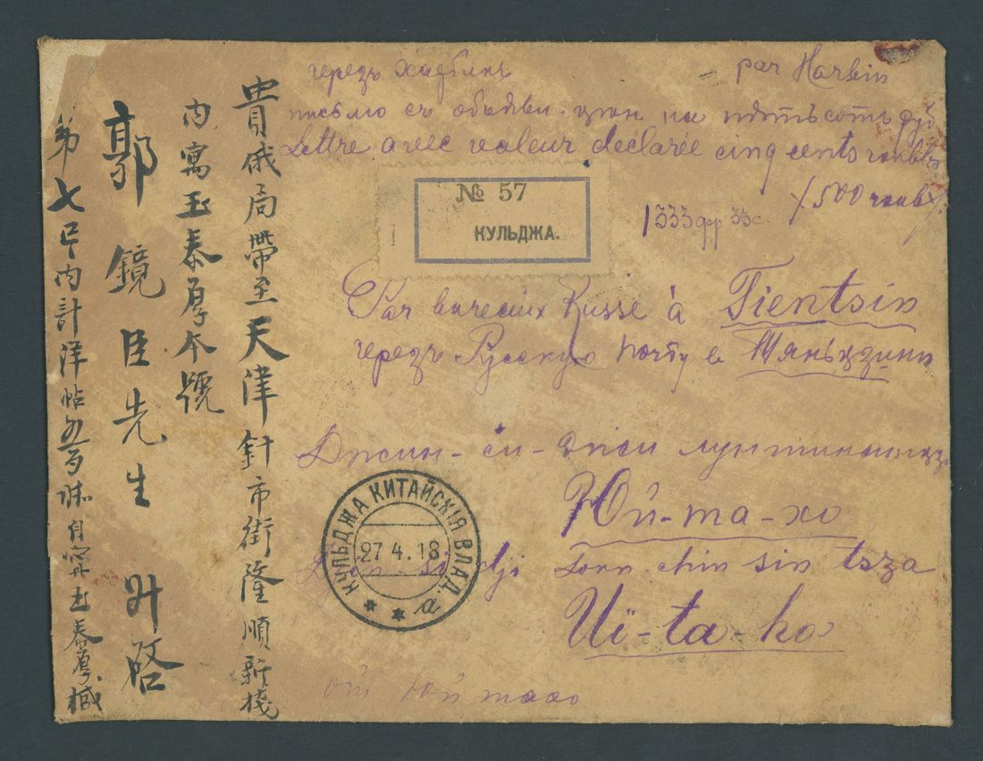 Kuldja: 1918 (27 Apr.) value declared (500 roubles) registered to Tientsin "par Harbin" bearing, on the reverse, Arms 5k., 35k. (6, one missing) and 70k. (10) tied by type K7A c.d.s. with Russian Tientsin arrival (19.6); there is a further despatch c.d.s. on the address side with the blue on white insurance label KII. The rate was 9r.50. The wax seals have been removed and the envelope exhibits paper browning. Photo