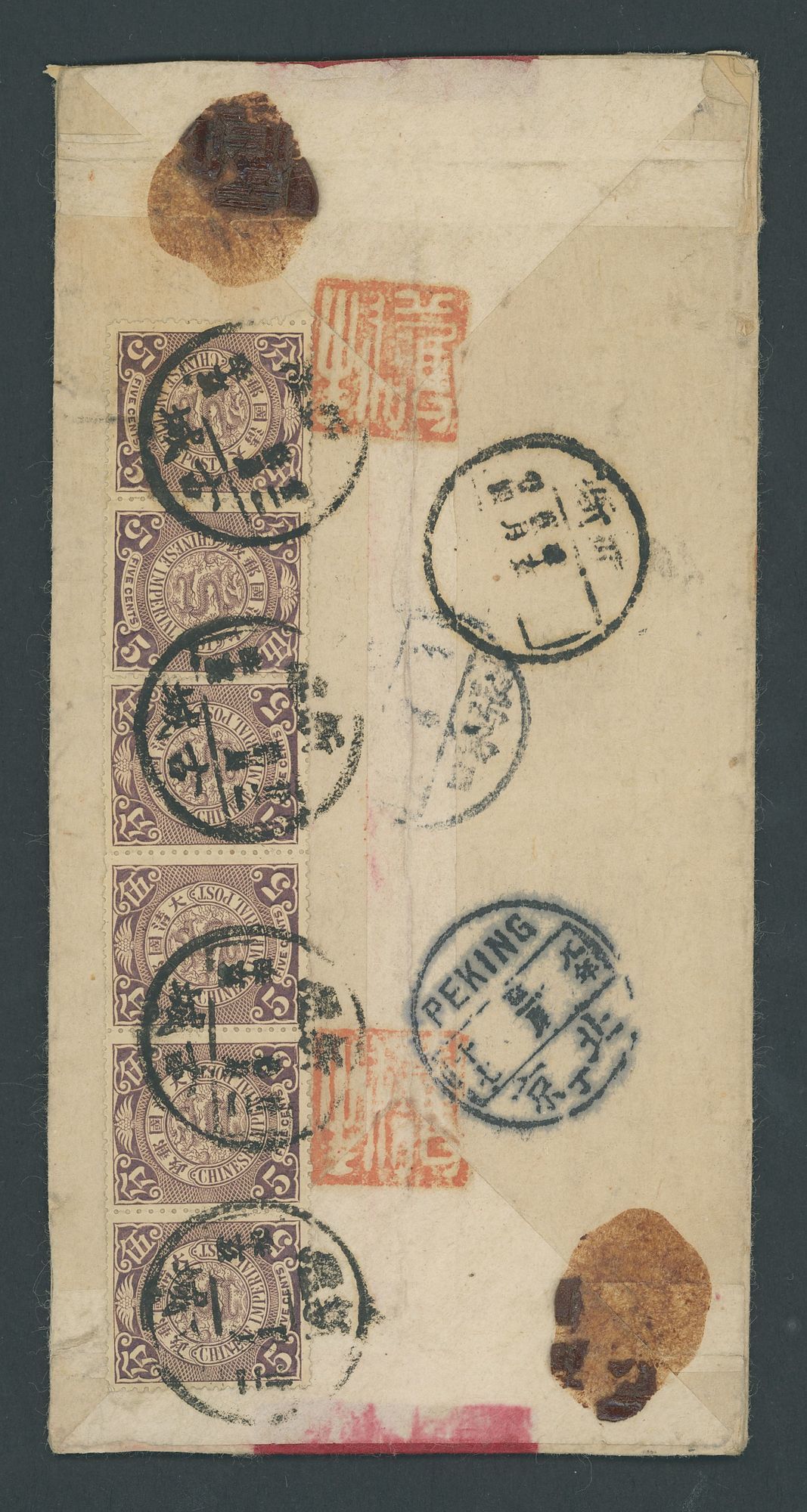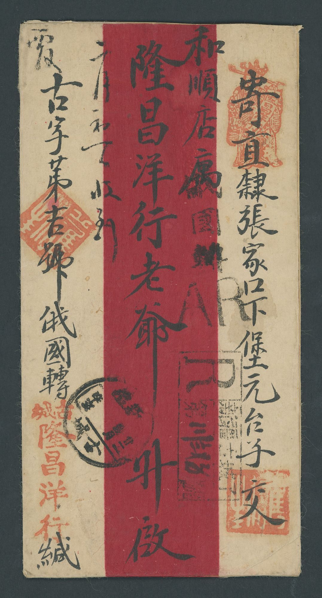 Kurchengze: 1911 (22 Dec.) opened-out red band envelope double registered to Peking bearing, on the reverse C.I.P. 5c. (6) tied by Chinese Sinkiang/Kurchengze c.d.s. with Tihwa and Kalgan transit and Peking (17.3) arrival c.d.s.; the address side bearing further despatch c.d.s., a superb strike of the boxed registered handstamp and "AR". Sent via Russia, pays 10c. international postage plus 10c. each for double registration. A rare and highly important cover. Photo