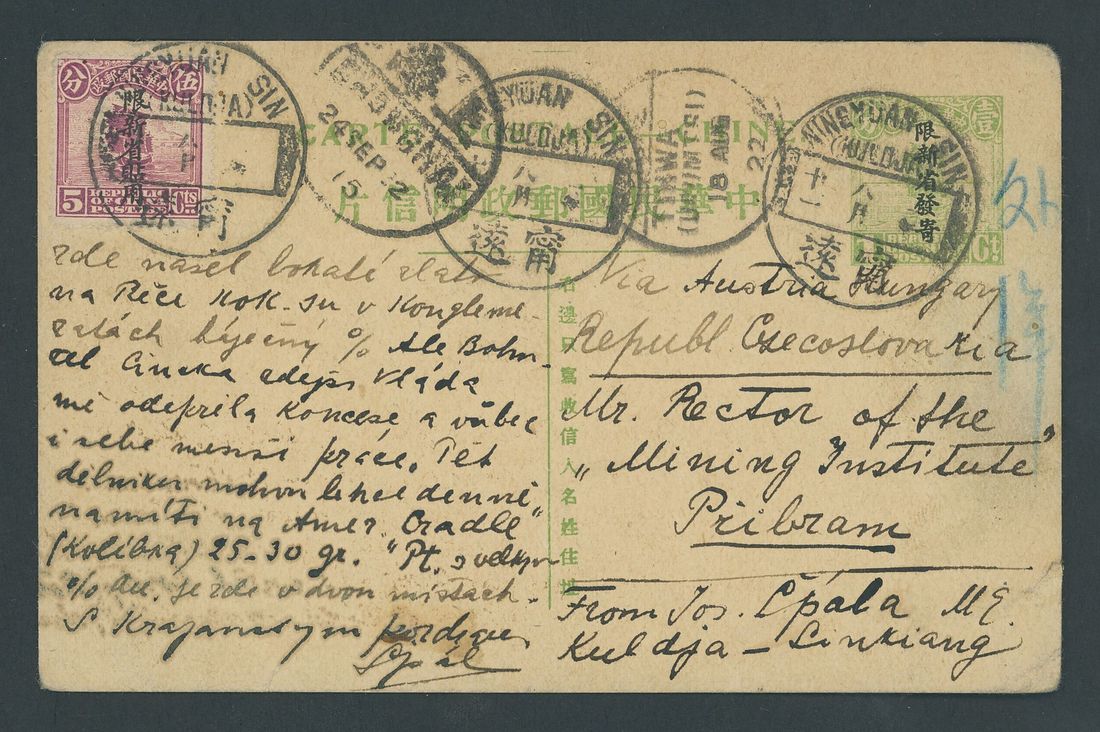 Kuldja: 1922 (10 Aug.) 1c. yellow-green stationery card to Czechoslovakia, uprated 5c. purple cancelled by good strikes of "