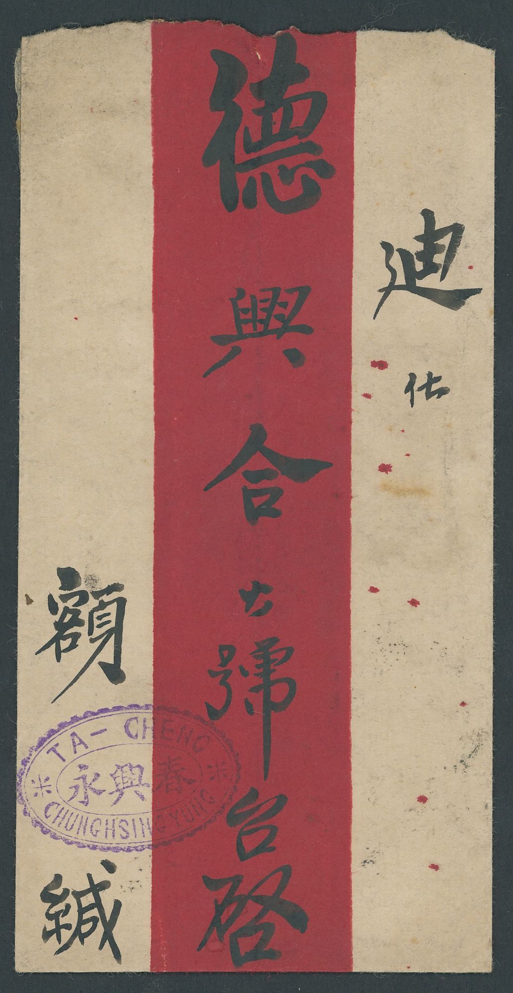 1931 (15 July) commercial red band envelope to Tihwa bearing, on the reverse, 1924-36 6c. tied by Hoshang Chinese c.d.s. with Tihwa (Urumtsi) arrival (23.7) alongside; with Provincial censor seal type 6 with censor handstamp in red; some light soiling. Photo