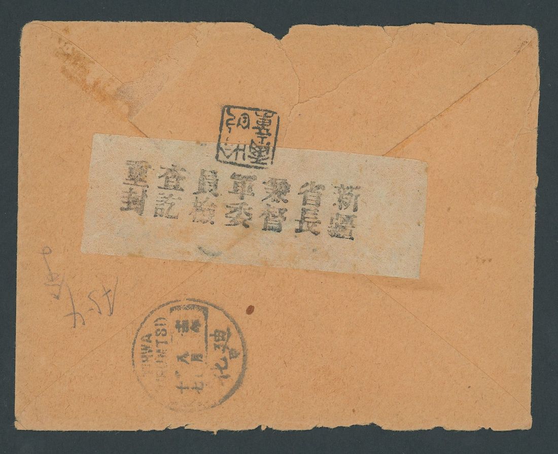 1924 (14 Aug.) envelope to Tihwa bearing 1916-19 6c. tied by Kitai English/Chinese c.d.s. with a second strike alongside, the reverse with Provincial censor label type 2 with black chop and Tihwa arrival (17.8); a little roughly opened at top. Photo