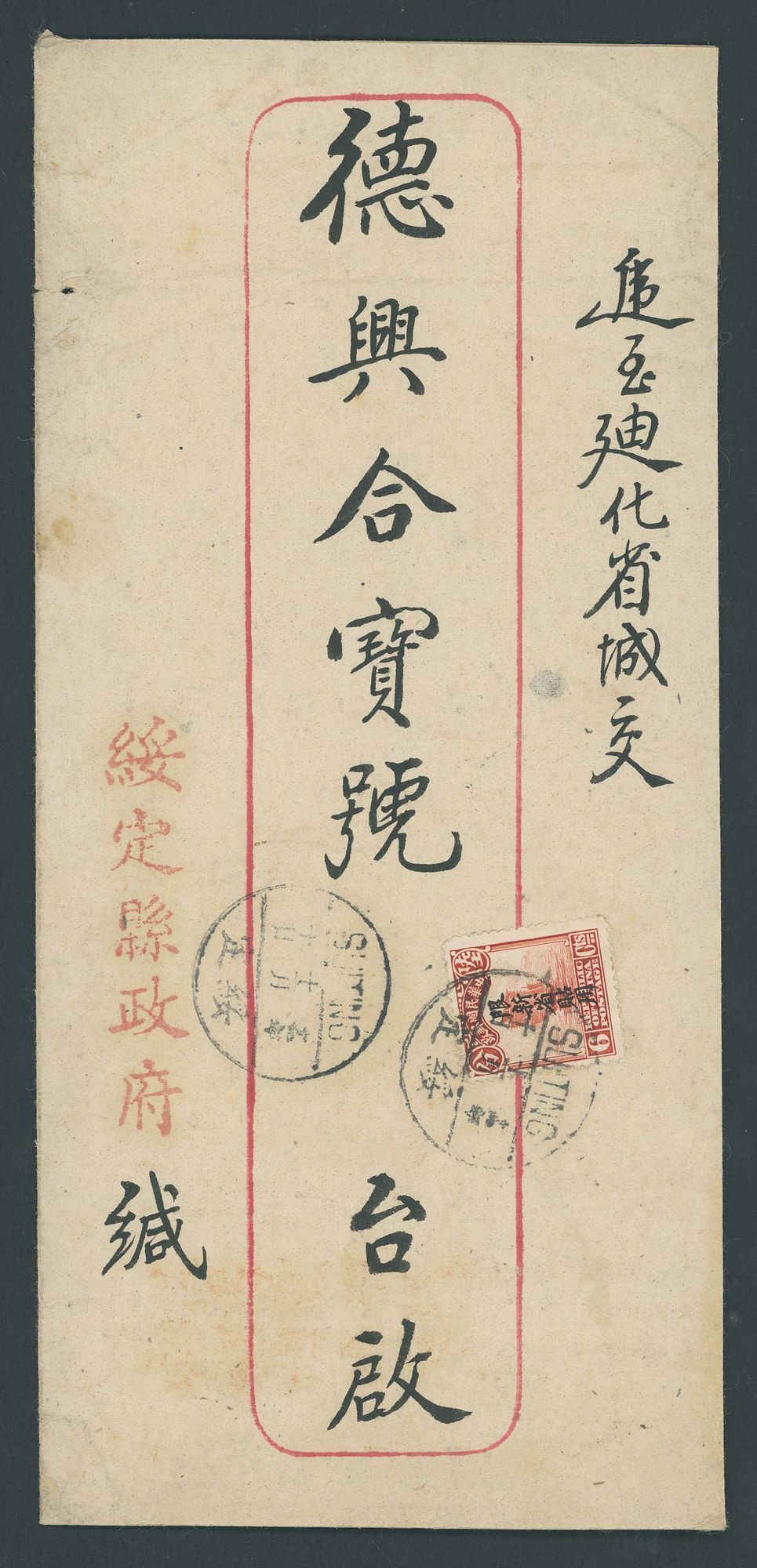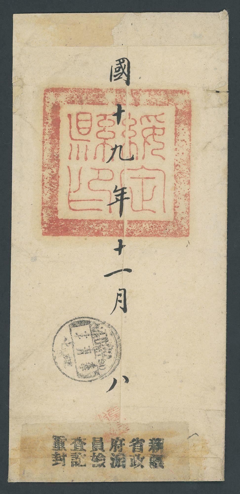 1930 (10 Nov.) official envelope to Tihwa bearing 1924-36 6c. tied by Suiting English/Chinese c.d.s. with a second strike alongside; the reverse with the large official seal handstamp, Tihwa arrival (17.11) and Provincial censor seal type 5 with red chop. Photo