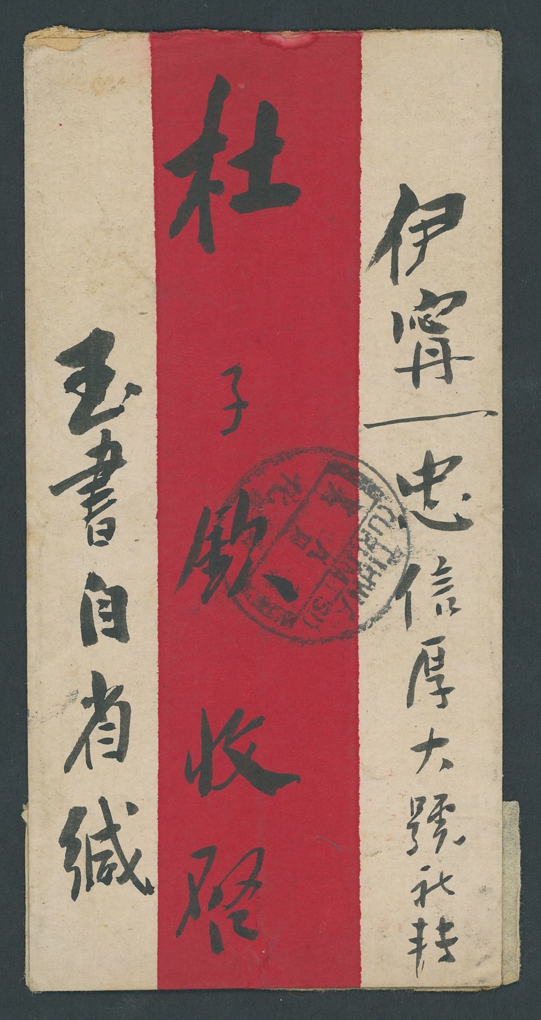 1920 (26 Aug.) red band envelope to Kuldja bearing, on the reverse, 1916-19 3c. (2) tied by Tihwa (Urumtsi) c.d.s. with Ningyuan Sin (Kuldja) c.d.s. alongside with Provincial censor seal type 2 with red chop, a further despatch c.d.s. on the address side. Photo