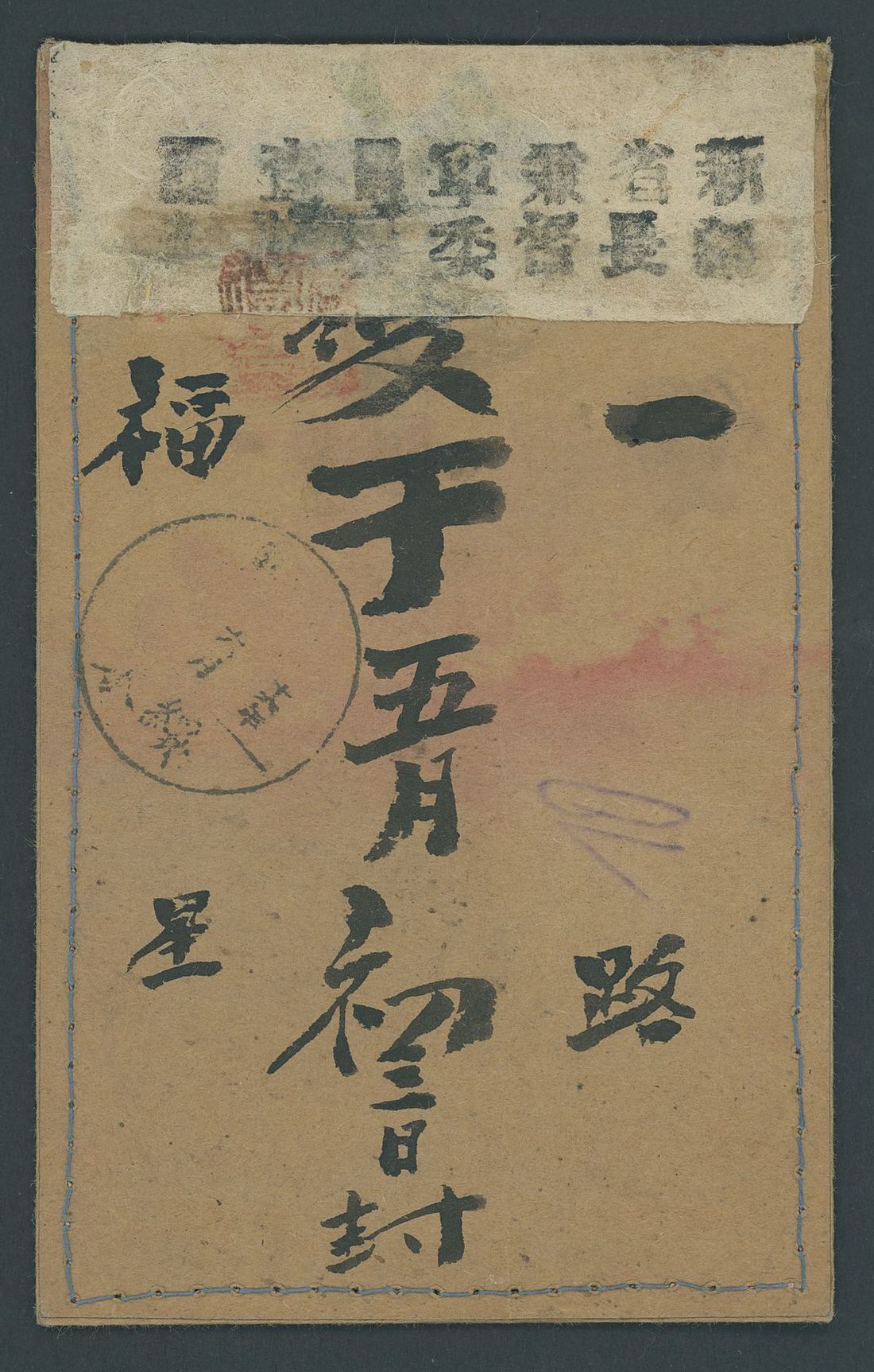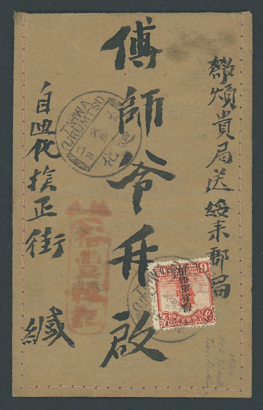 1927 (2 June) brown stitched envelope to Manass bearing 1924-36 6c. bright scarlet tied by a fine strike of Tihwa (Urumchi) c.d.s. with a second strike alongside, the reverse with indistinct Manass arrival c.d.s. and Provincial censor seal type 2. Photo