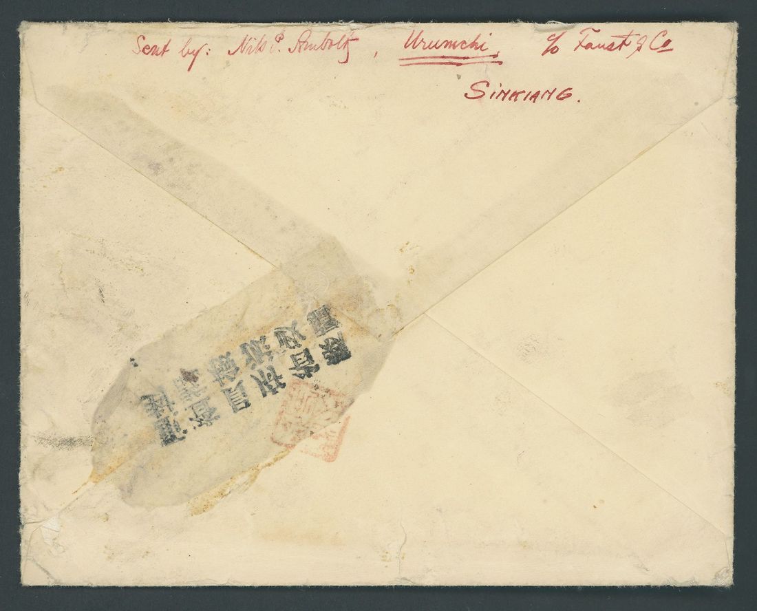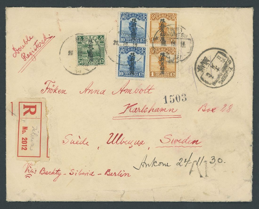 1930 (28 Oct.) Nils Ambolt envelope "Double Registered" to Sweden "Via Bachty - Siberia - Berlin" bearing 1916-19 50c. with pairs of 1924-36 1c. and 10c. tied by Tihwa/Urumchi c.d.s. with red on white registration label with manuscript insertion, faint "AR" and the scarce Tancheng, Chuguchak foreign exchange office c.d.s. (6.11); the reverse, with Provincial censor seal type 5 applided face down with censor chop in red. Pays the short-lived 32c. postage (double weight) plus 40c. double registered. Photo