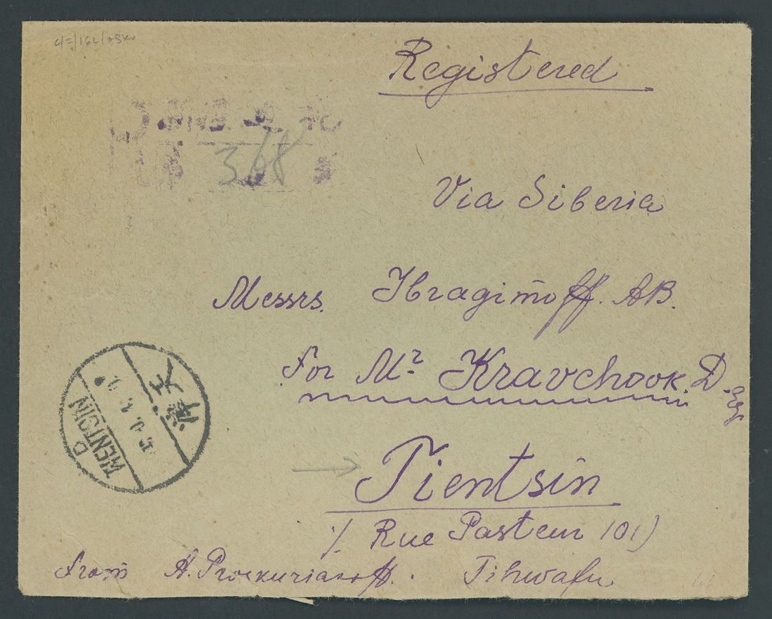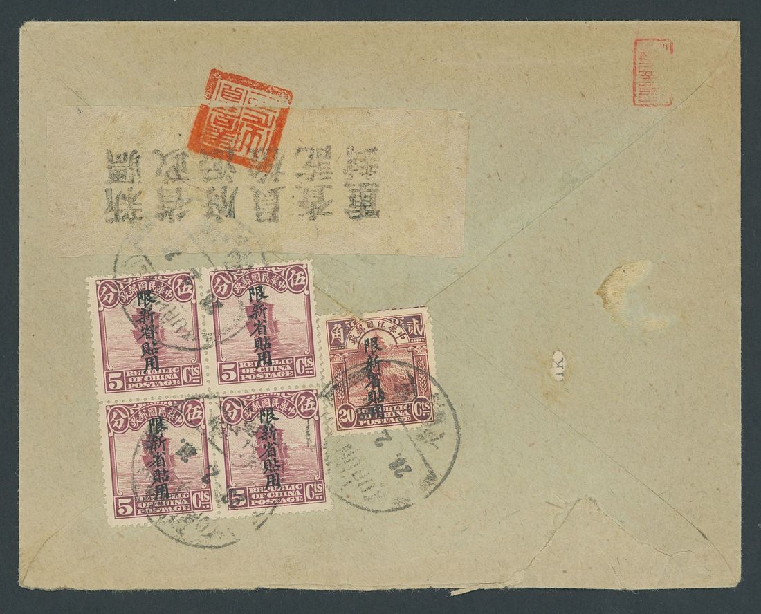 1931 (23 Feb.) envelope registered to Tientsin bearing, on the reverse, 1924-36 5c. block of four and 20c. tied by Tihwa/Urumsti c.d.s. with Provincial censor seal type 5 tied by the censor's chop in red, the address side with an indistinct strike of the boxed registered handstamp in purple and Tientsin arrival c.d.s. Sent via Siberia taking 46 days in transit. Pays the short-lived rate of 20c. postage plus 20c. registration. Photo