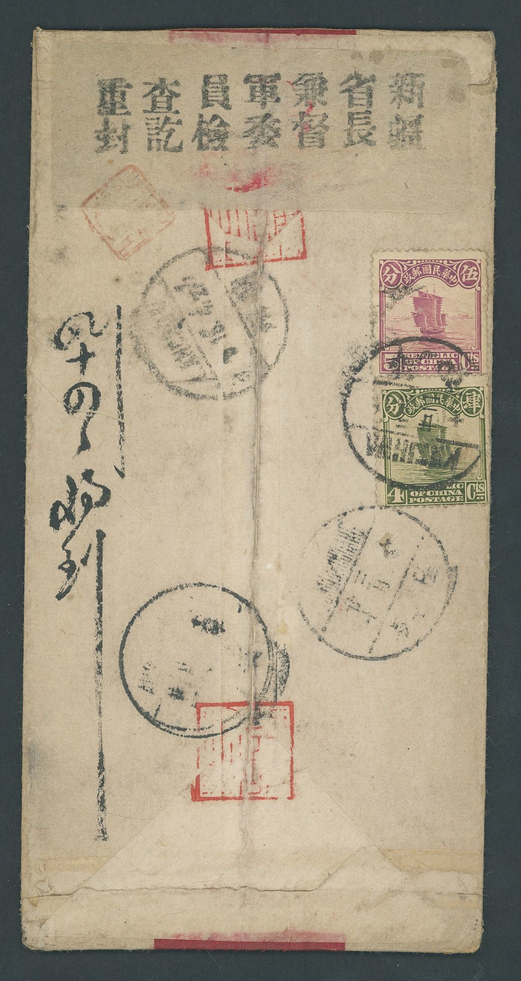 1925 (c.) (22 Feb.) red band envelope to Chensi bearing, on the reverse, 1923-33 Junk 4c. and 5c. tied by Kweihwa, Fukien English/Chinese c.d.s. with Lanchow transit and unclear arrival c.d.s., with Provincial censor seal type 2 with red chop