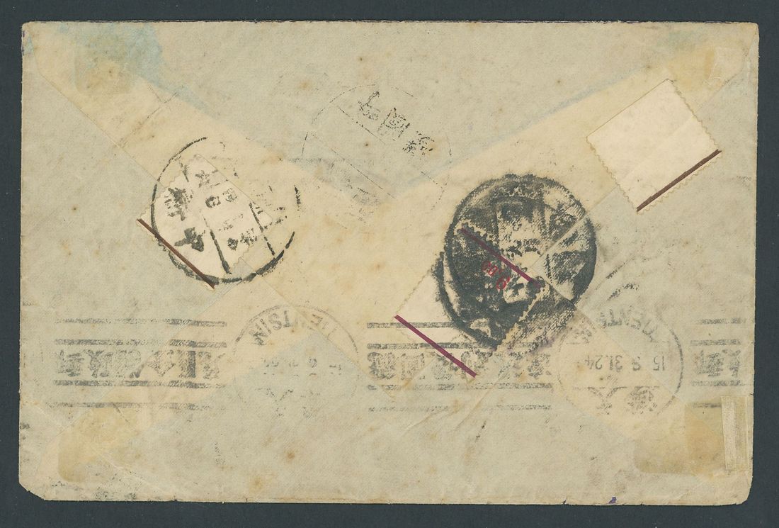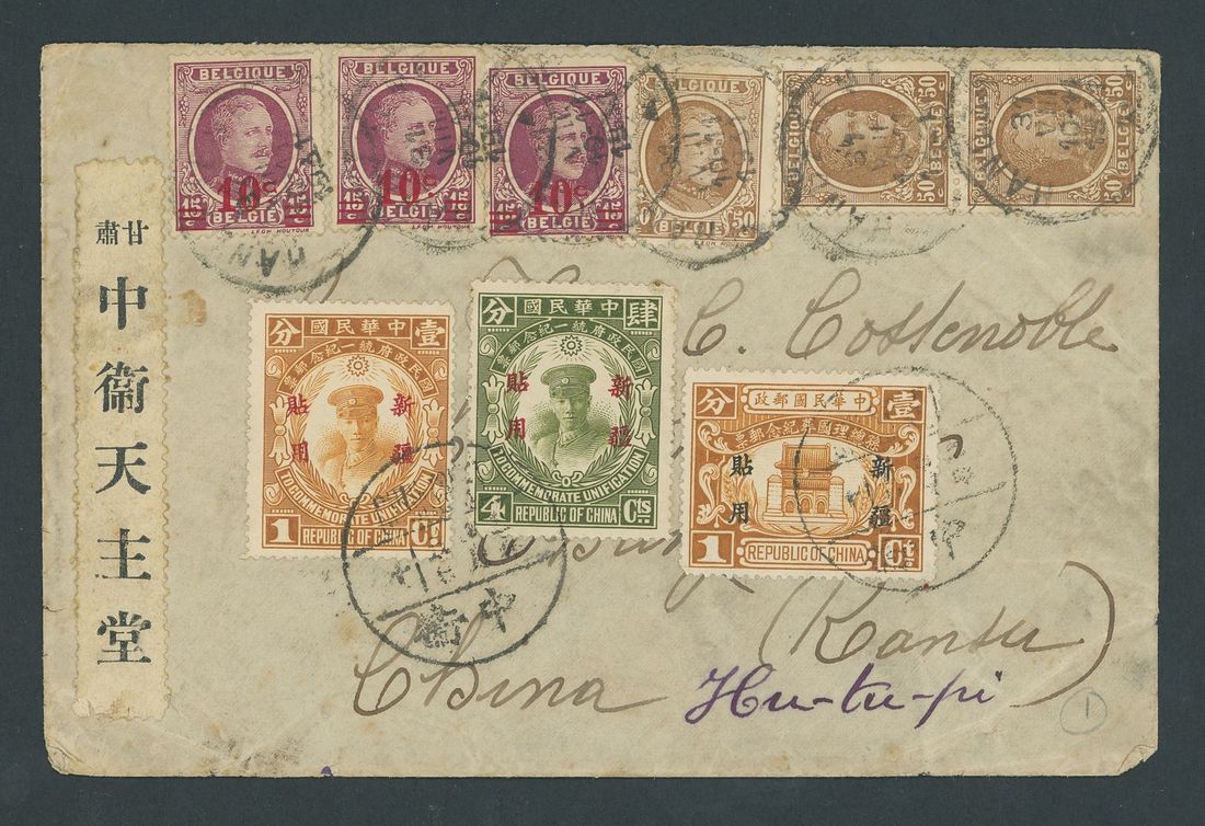 1931 (31 Aug.) envelope to Chungwei, Kansu, redirected to Hutubi bearing Belgium 10c. on 15c. (3) and 50c. (3) tied by Handzaeme c.d.s., with Sinkiang overprints on Unification 1c. and 4c. plus State Burial 1c. cancelled by Chungwei English/Chinese c.d.s.; various backstamp including Tientsin roller postmark. An interesting redirected envelope from Europe. Photo