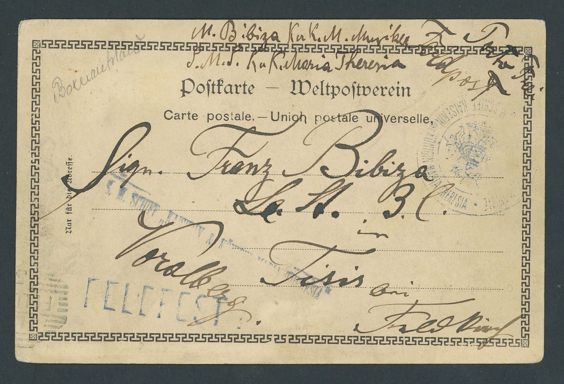 1901 (7 Apr.) picture post card of a military band from Taku to Feldkirche with manuscript and handstamped Feldpost with straight-line "