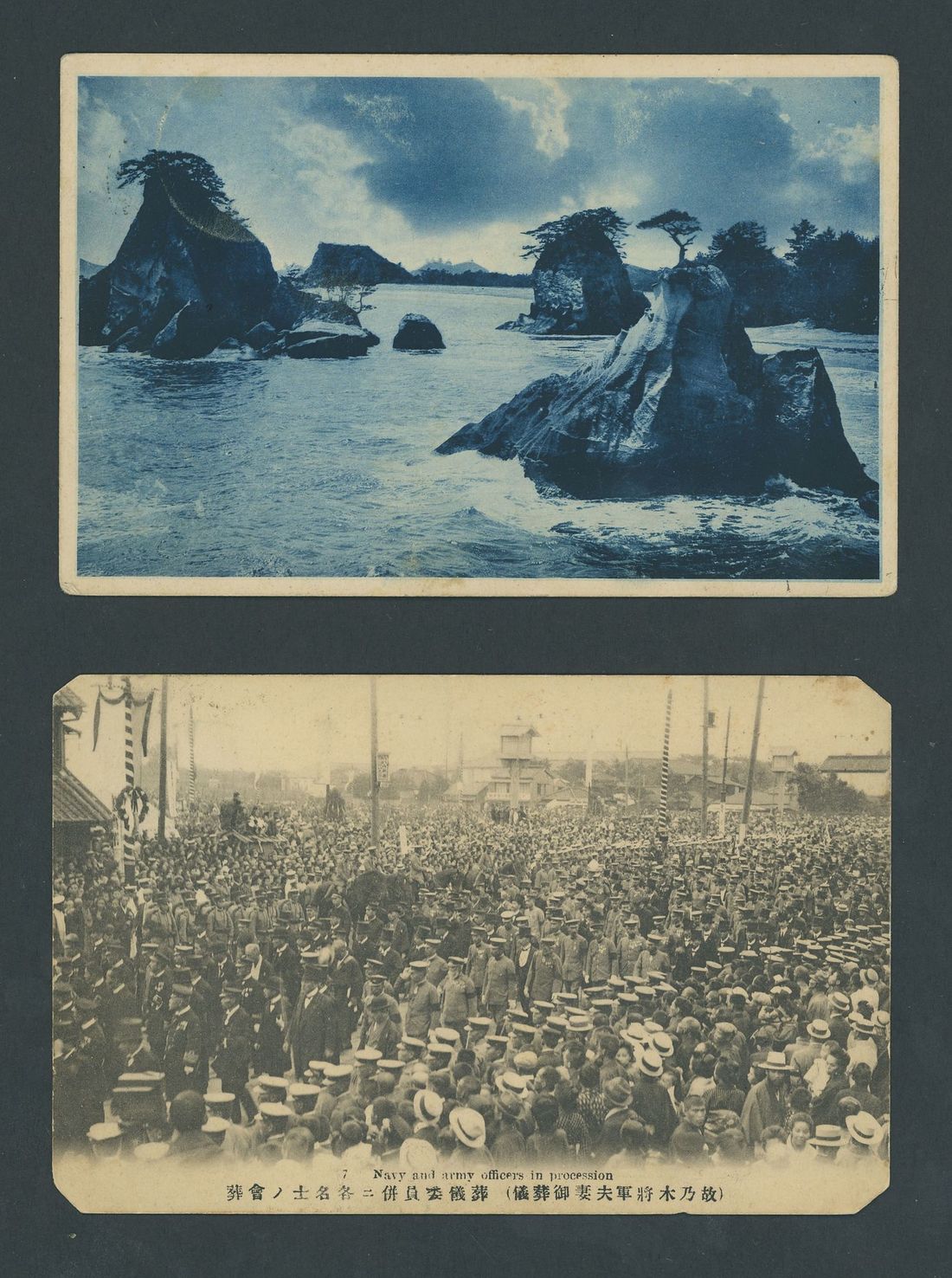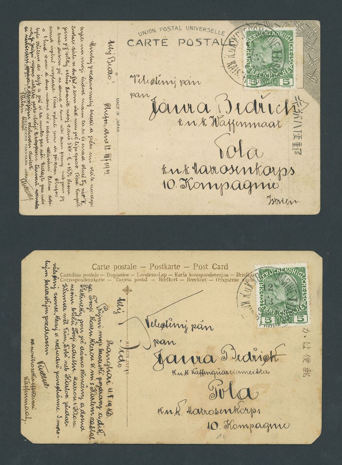 1913 (Jan.- July) two picture post cards from the same correspondence sent from Shanghai or Chefoo to Pola bearing 1908 60th Anniversary 5h. tied by "