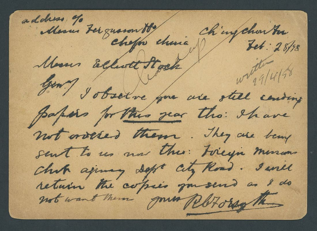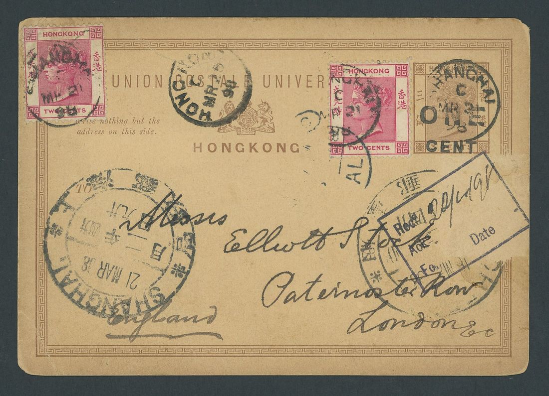 1898 (16 Mar.) Hong Kong One Cent on 3c. stationery card to London, the C.I.P. 4c. has been removed which was originally tied by the Chefoo Dollar dater, with Hong Kong Q.V. 2c. carmine (2) tied by Shanghai c.d.s. (21.3) with Shanghai Dollar daters and a boxed receiver's handstamp over where the Chinese stamp was; some wear in the corners and light ageing