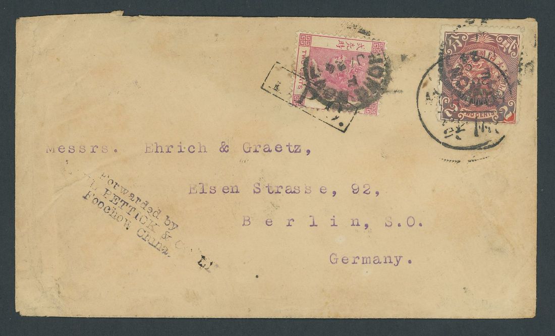 I.P.O. Tieprint: 1900 (20 Jan.) envelope to Germany (flap missing) bearing C.I.P. 2c. red tied by Foochow bilingual c.d.s. and Hong Kong transit, with Hong Kong Q.V. 2c. carmine tied by Hong Kong code "F" c.d.s. and a good strike of the Foochow I.P.O tieprint and with a good strike of the unframed "Forwarded by/