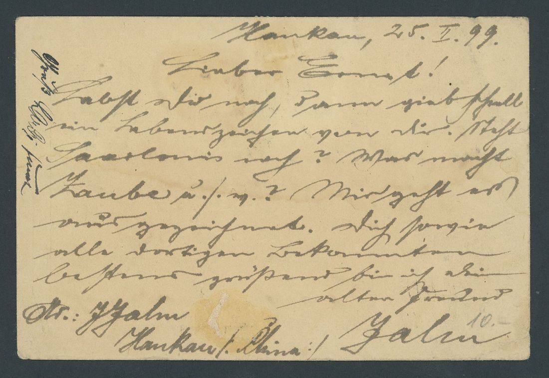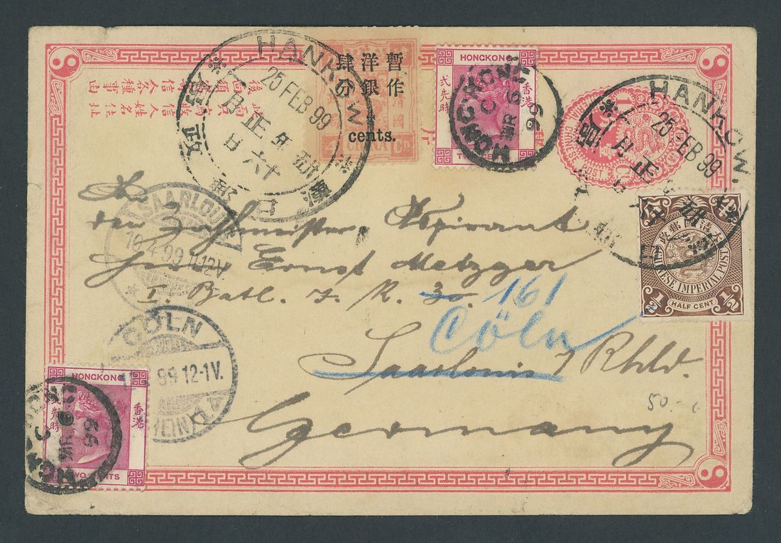 1899 (25 Feb.) China first issue stationery card uprated with 1897 Small Figures 4c. on 4ca. with C.I.P. ½c. cancelled by Hankow Dollar dater with Hong Kong 2c. carmine (2) cancelled by Hong Kong (6.3) c.d.s. plus Saarlouis and (redirected) Cologne (12.4) c.d.s. A scarce franking with the surcharge adhesive. Photo