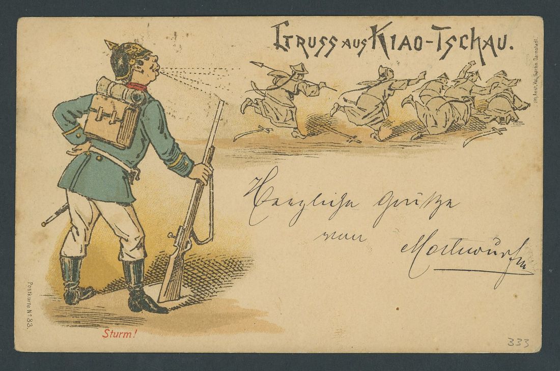 1898 (5 Apr.) propaganda postcard to Austria bearing I.C.P. 4c. tied by a superb strike of the Kiungchow Dollar dater, with Hong Kong Q.V. 2c. carmine pair tied by Hong Kong c.d.s. (7.4), "