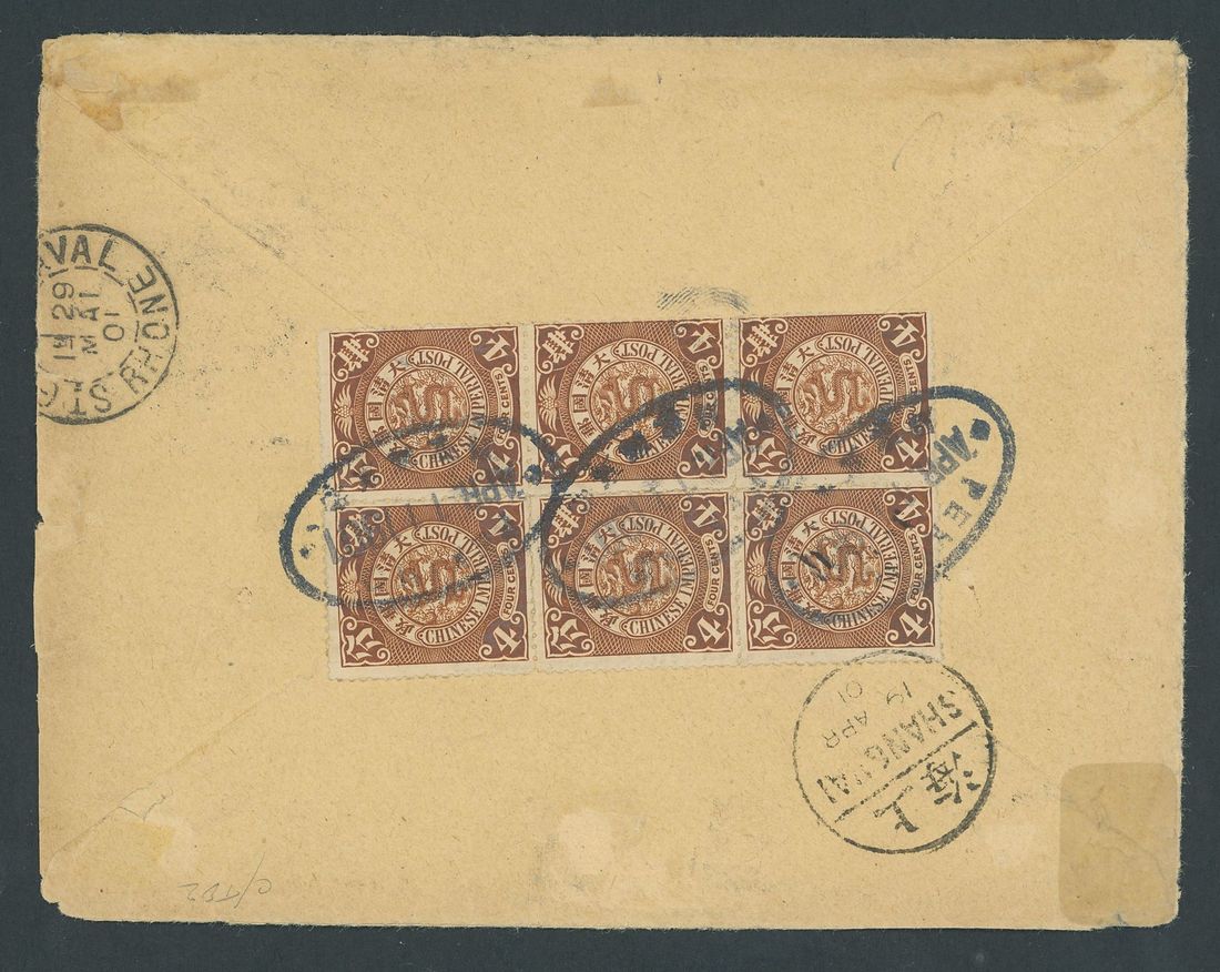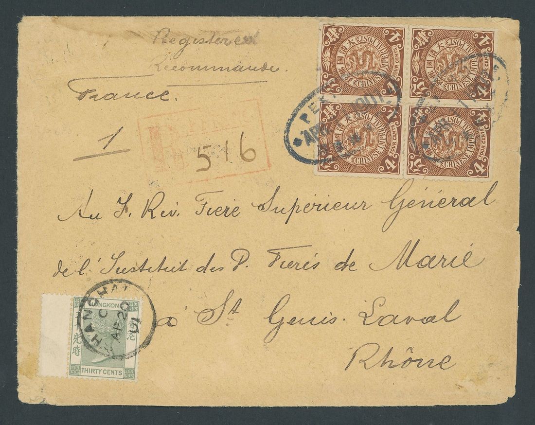 1901 (11 Apr.) envelope registered to France bearing C.I.P. 4c. (10, 6 on reverse) tied by Peking bilingual dated oval with a neat strike of boxed "R/