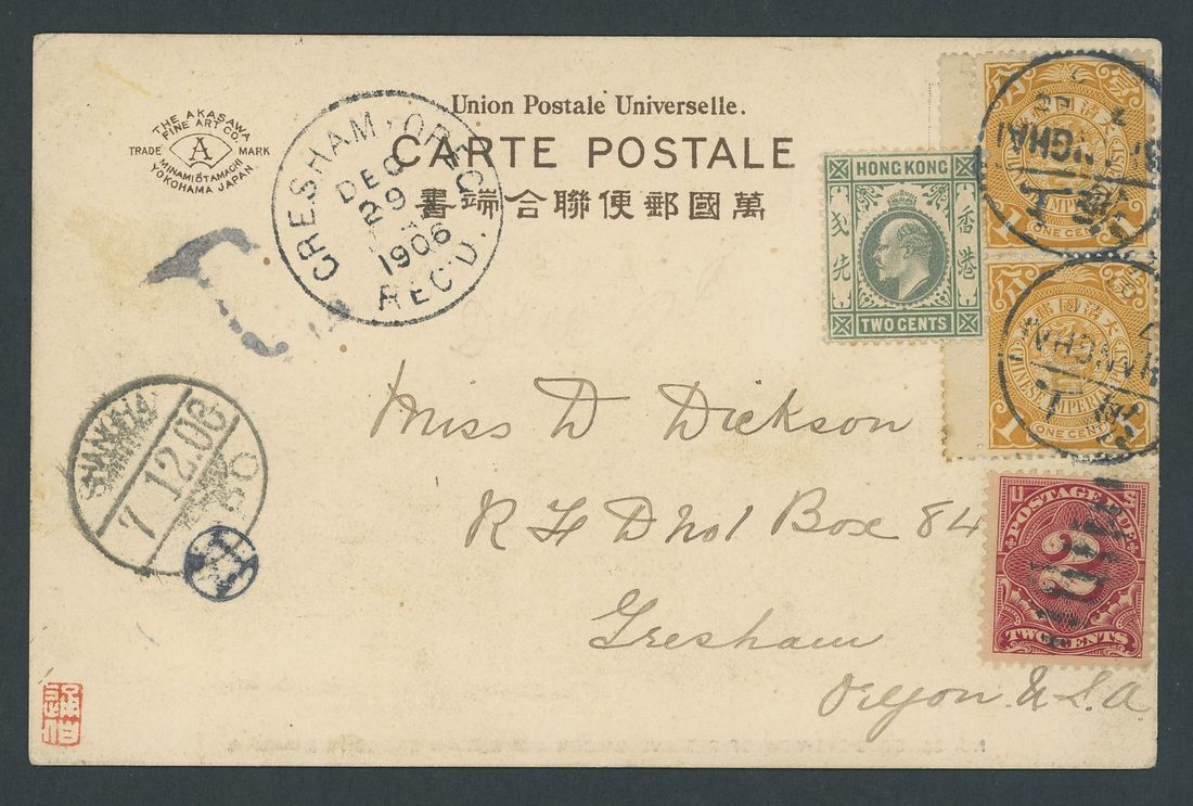 1906 (7 Dec.) picture post card to U.S.A. bearing C.I.P. 1c. pair tied by Shanghai bilingual c.d.s. with Hong Kong K.E.VII 2c. left uncancelled, with Japanese P.O. Shanghai c.d.s., Gresham arrival c.d.s. (29.12) and pre-cancelled U.S. 2c. Postage Due. The Hong Kong stamp not accepted as postage, hence underpaid