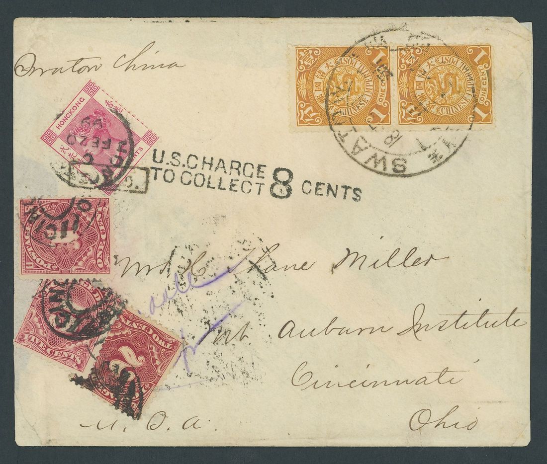 I.P.O. Tieprint: 1899 (19 Feb.) envelope to Ohio sent printed paper rate, bearing pair of C.I.P. 1c. tied by a fine strike of Swatow Dollar dater, with Hong Kong 2c. carmine tied by Hong Kong c.d.s. and a good strike of type 1 I.P.O. handstamp, underpaid and showing a fine strike of "