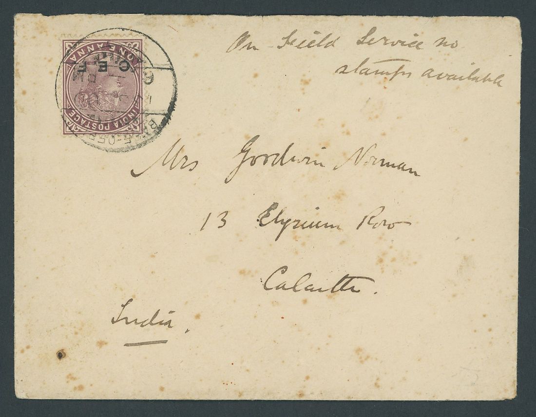 Field Post Office No. 4 (Tientsin): 1900 (1 Sept.) envelope (flap missing) to Calcutta "On Field Service no stamps available", sent under C.E.F. order 942 through F.P.O. No.4 to Base Office where 1900 "C.E.F." 1a. plum was added and tied by Base Office c.d.s. type 1 (3.9), the reverse bearing F.P.O. No.4 (1.9), Tuticorn (28.9) and Wellesley Street, Calcutta (4.10) c.d.s.; several light tone spots, very scarce. Photo