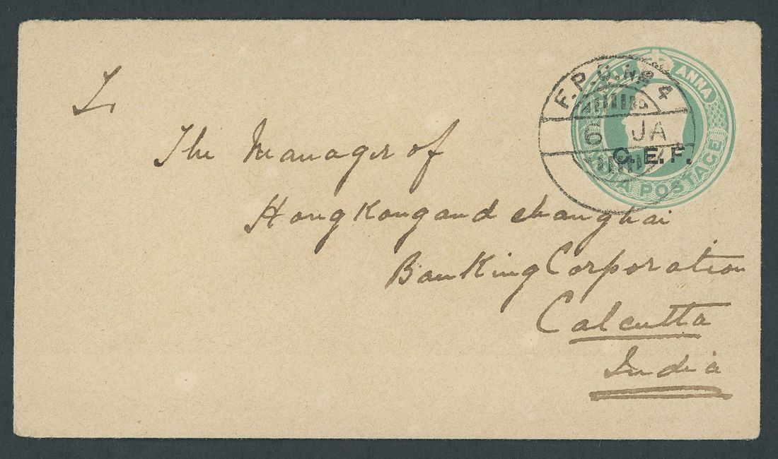 Field Post Office No. 4 (Tientsin): 1905 (6 Jan.) K.E.VII ½a. stationery envelope to the Hong Kong and Shanghai Bank in Calcutta cancelled by a fine strike of the type 50 (Proud D5) c.d.s. but without yeardate, the reverse with Tuticorn (30.1) and Calcutta (3.2) c.d.s. Ex Wilson Wong