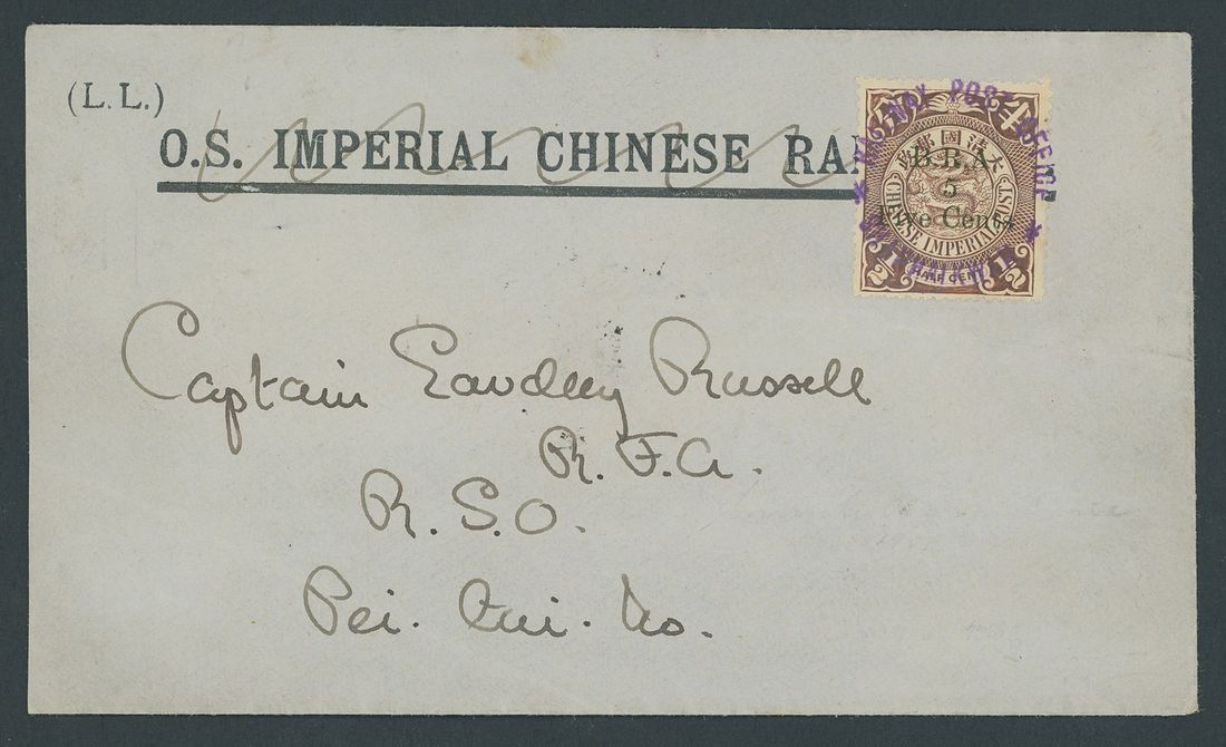 Shanhaikwan: 1901 (14 May) printed envelope of the O.S. Imperial Chinese Railway (crossed through in pencil) with B.R.A. 5c. variety surcharge in green tied by "
