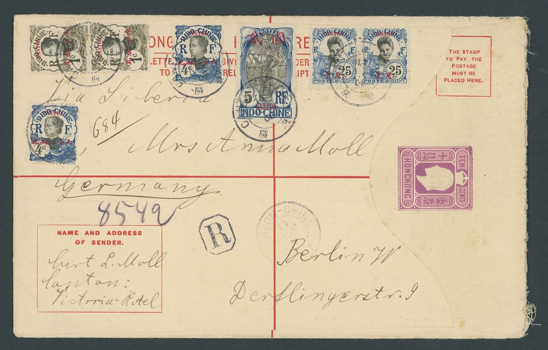 1908 (14 Nov.) Hong Kong K.E.VII 10c. registered envelope, size H, to Berlin, not cancelled and bearing Indo-China "