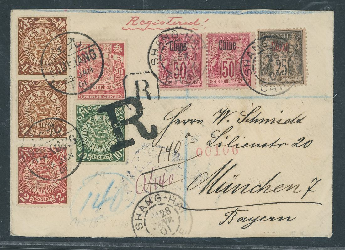 1901 (23 Jan.) envelope registered to Germany bearing C.I.P. 2c., 4c. (2), 10c. and 30c. tied by Kiukiang bilingual c.d.s. and large "R" in black, with French "Chine" 25c. and 50c. (2) tied by "