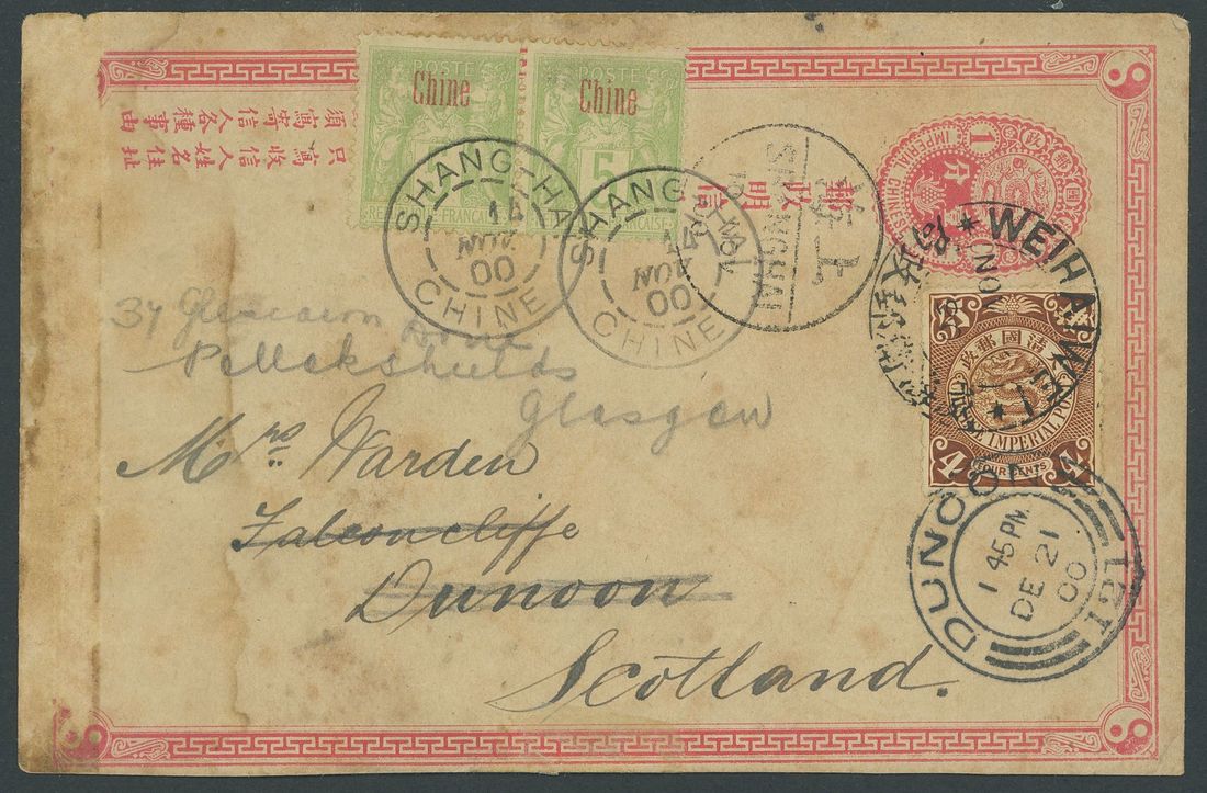 1900 (2 Nov.) first issue 1c. postal stationery card to Dunoon in Scotland uprated C.I.P. 4c. tied the double-circle, bilingual "