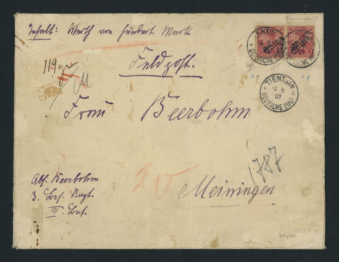 Tientsin "China" Overprint: 10pf. carmine, a horizontal pair, the right stamp showing clear doubling of the handstamp, affixed on 1901 (14 Aug.) large "Feldpost" cover from Tientsin to Germany and cancelled by good strikes of "
