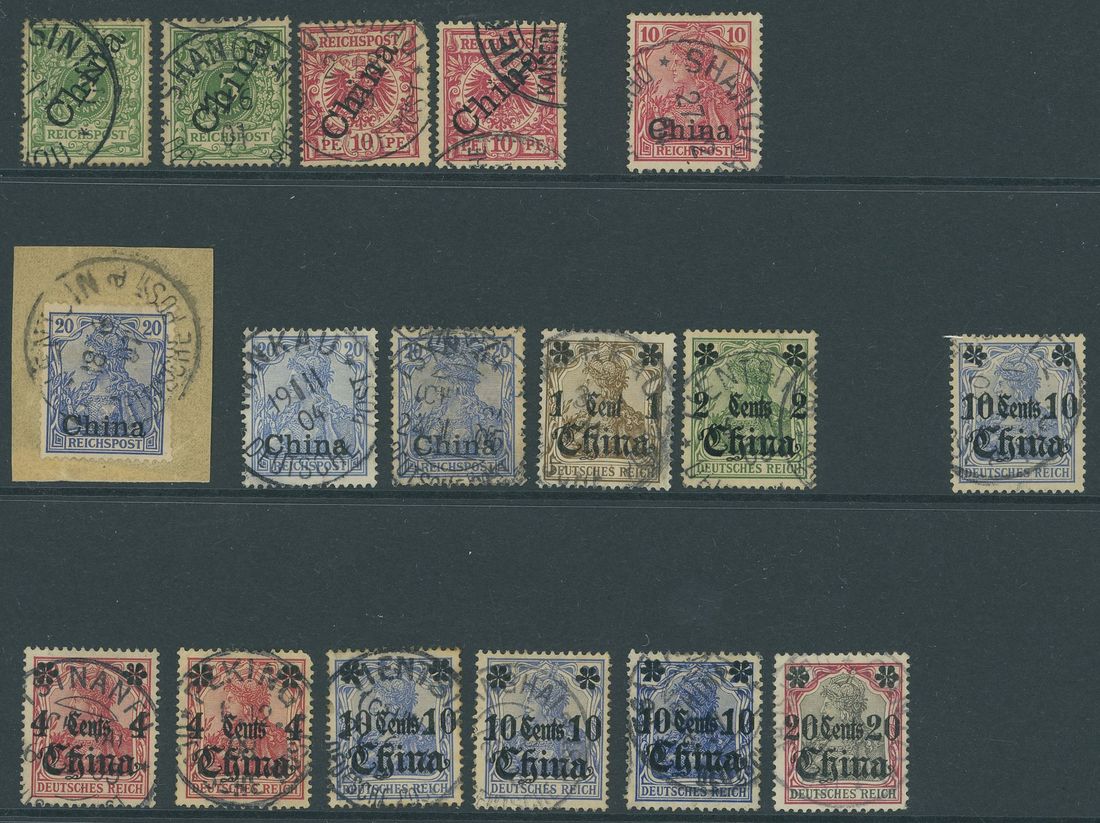 1905 Chinese Currency Without Watermark: 10c. on 20pf. ultramarine, variety left star broken cancelled by 1907 c.d.s; small thin on the reverse. Steur Certificate (1990). Also a used selection of adhesives (16)