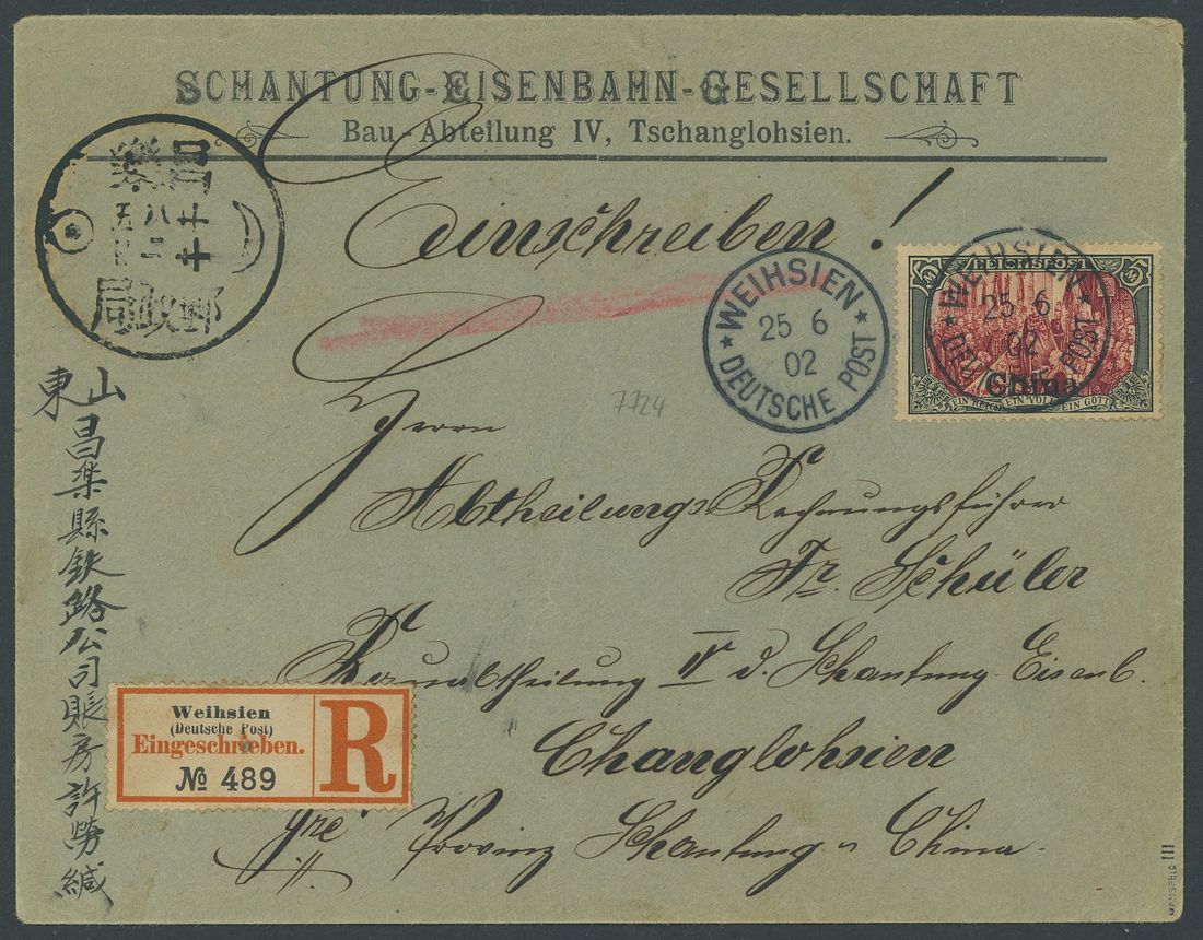 1902 (June) German commercial envelope registered from Tschanglohsien to Changwhien bearing German Post Office 1901-04 5m. overprinted "China" and cancelled by Weihsien c.d.s. (25.6) with a second strike alongside and the registration label at foot, the left corner bearing a fine strike of the Changlo Sun and Moon dater with a second strike on the reverse. A rare and desirable cover. Photo