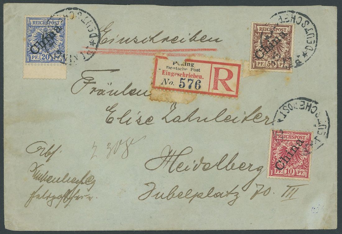 1900 (Nov.) blue envelope registered to Heidelberg bearing 1898 (48 degrees), 20pf. and 50pf. with (56 degrees) 10pf. tied by good strikes of the undated "