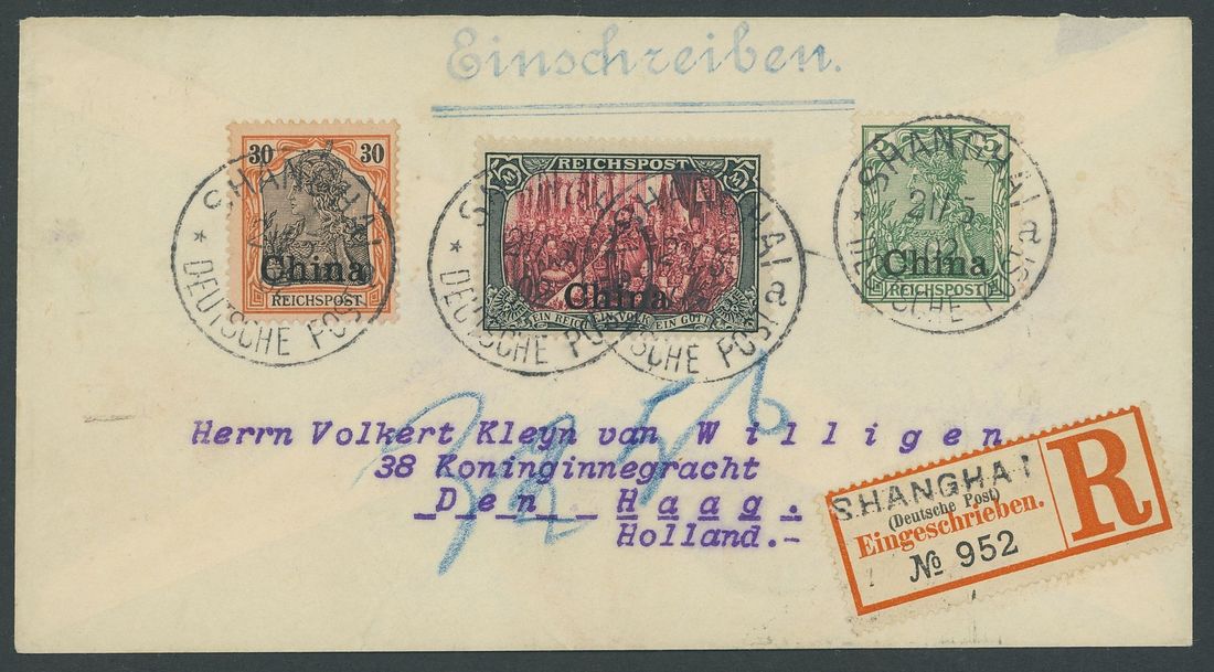 1902 (21 May) envelope registered to Holland bearing 1901 5pf., 30pf. and 5m. (Mi. 27III) tied by four strikes of Shanghai type 5 c.d.s. code "a" and with orange on white registration label, Gravenhage arrival (30.6) on the reverse. Photo